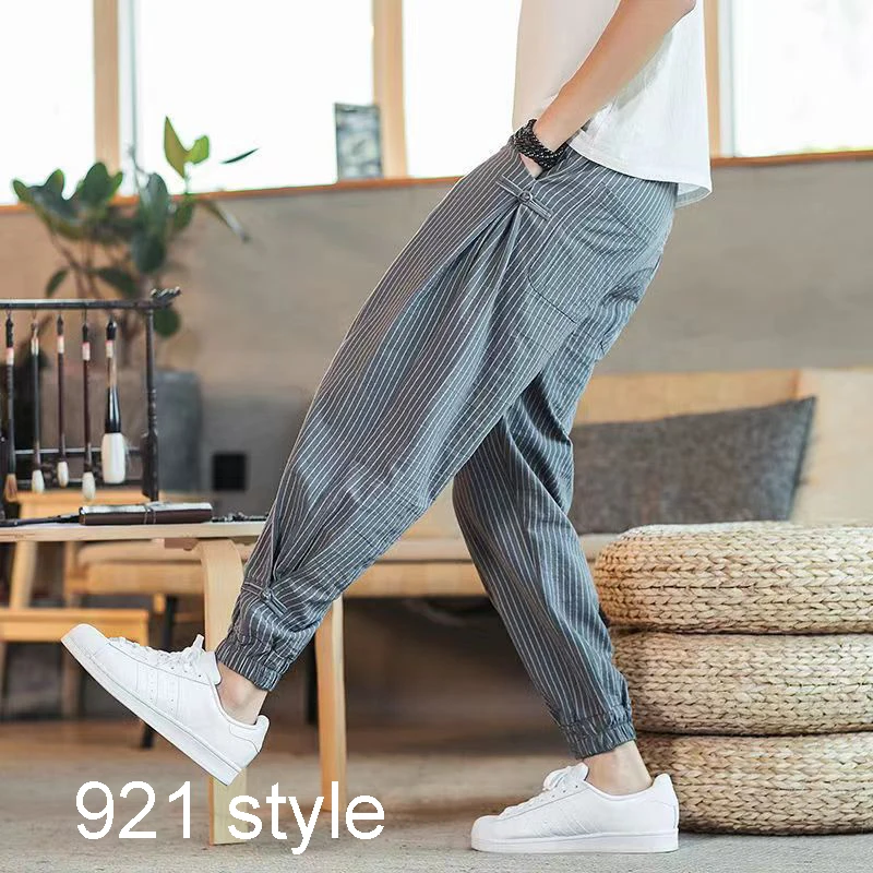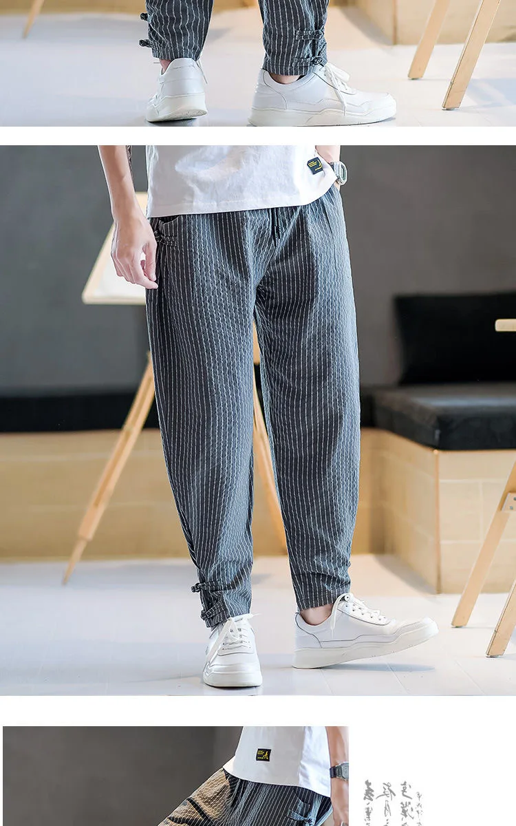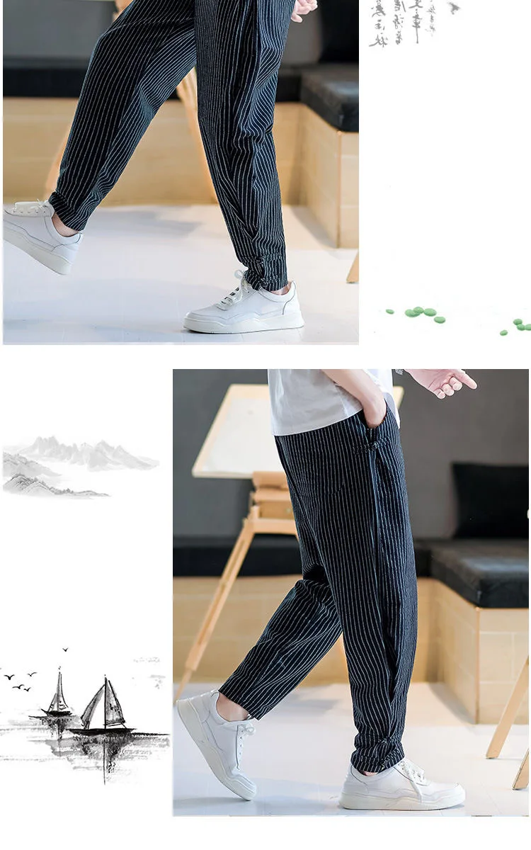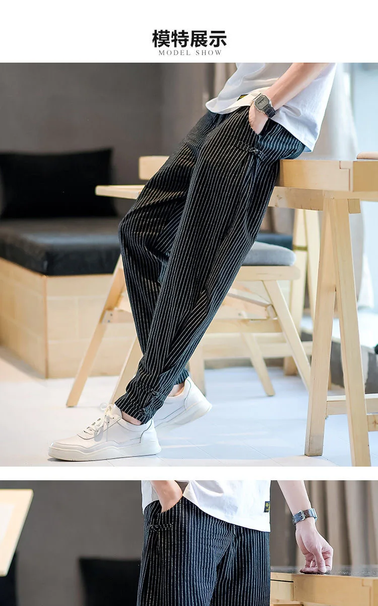 Отзывы о Шаровары мужские тонкие в полоску дышащие брюки-карандаш из хлопка и льна Модные