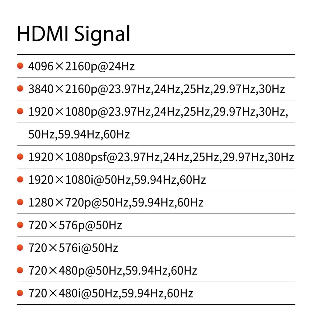 3840 × 2160p @ 30Hz 24HZ, 4096 × 2160p @ 30Hz 24Hz, 1920 × 1080p@23.98Hz,24Hz,25Hz, 29,97Hz,30Hz, 50,94Hz, 60 Гц, 1920 × 1080psf@23.98Hz,24 Гц, 25 Гц, 29,97 Гц, 30 Гц