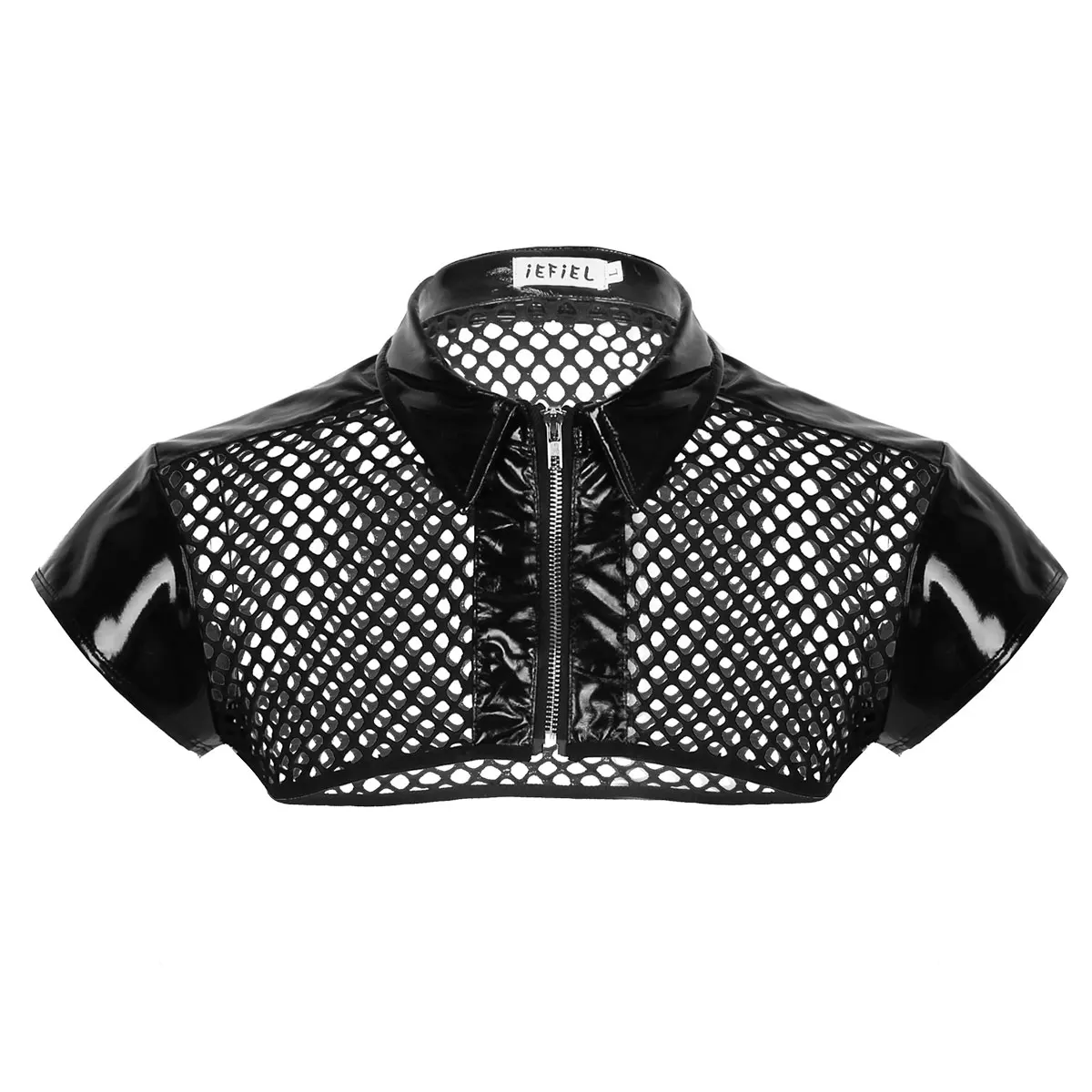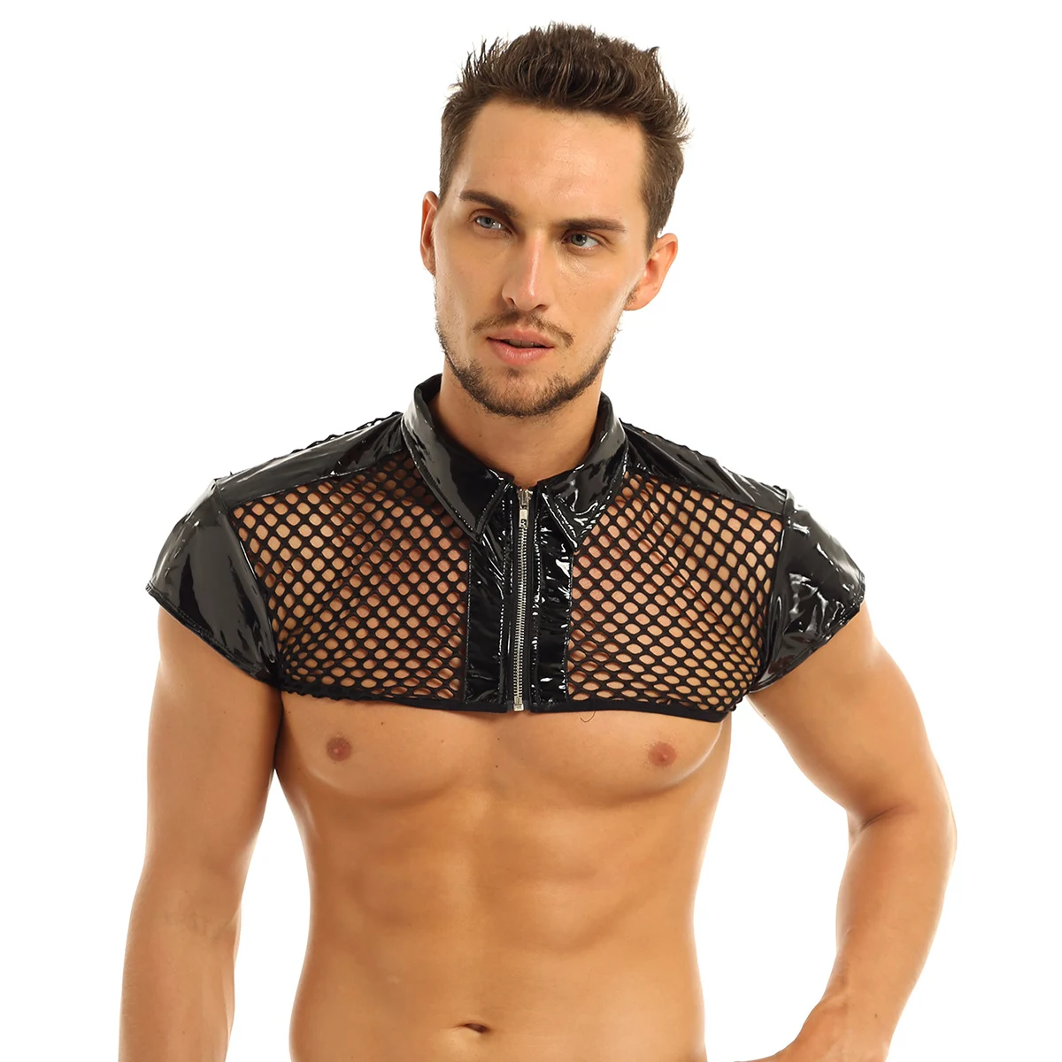 # M-XXL Мужская прозрачная сетчатая рубашка из лакированной кожи с рукавами-крылышками на плече, нагрудная рубашка, Клубная одежда, костюм, половина топа на бретелях