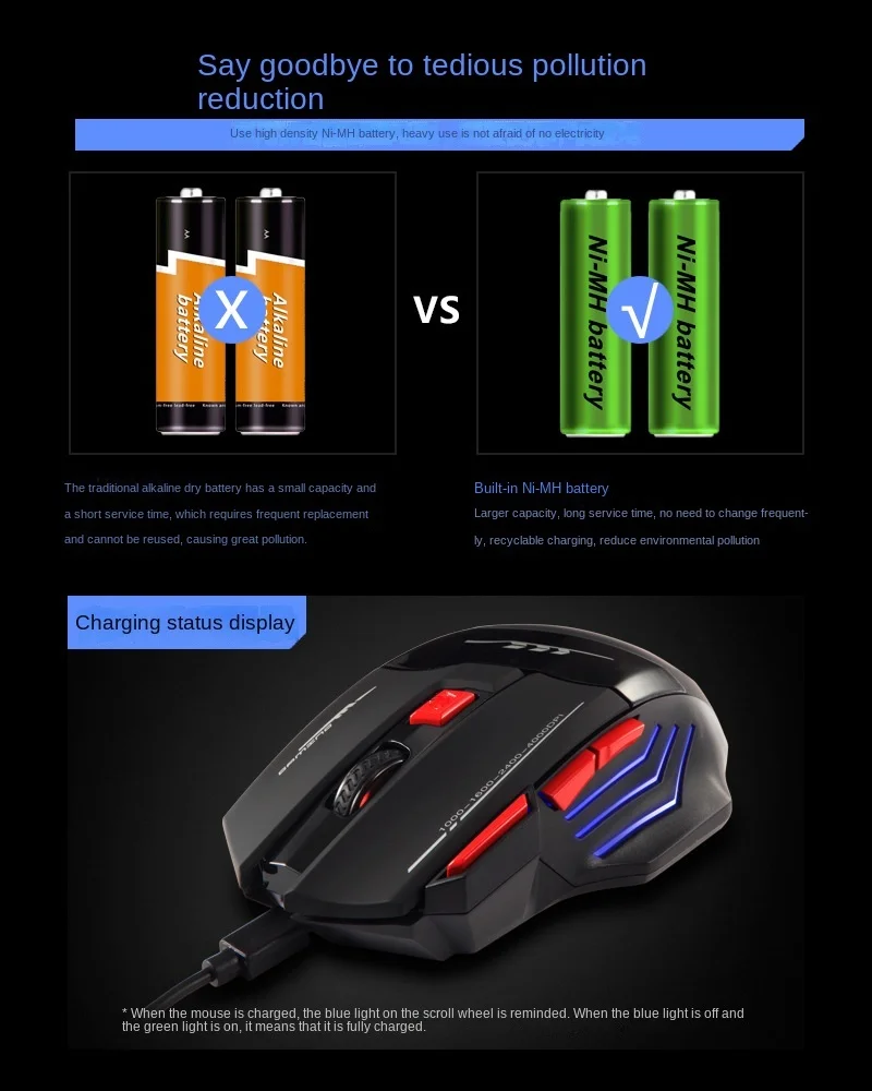 ● При зарядке мыши напоминает синий светильник на колесе. Когда синий светильник выходит из строя и зеленый светильник включен, это означает, что он полностью заряжен.