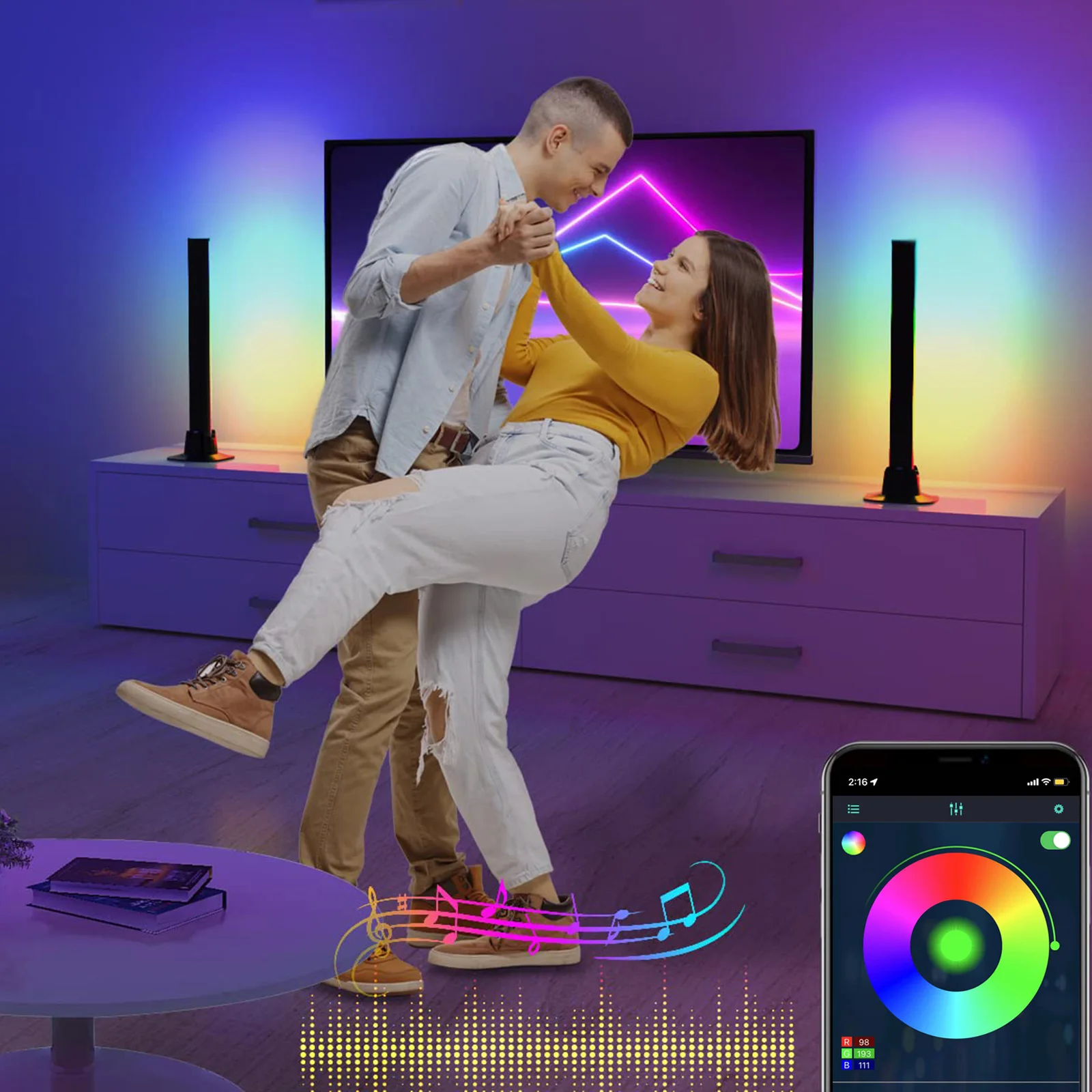 3. Синхронизация музыки: Встроенный микрофон, RGB светильник бар Синхронизация с музыкой или окружающим звуком. Четыре режима (классический, мягкий, динамический, диско), идеально подходит для вечеринок и игровых миров.