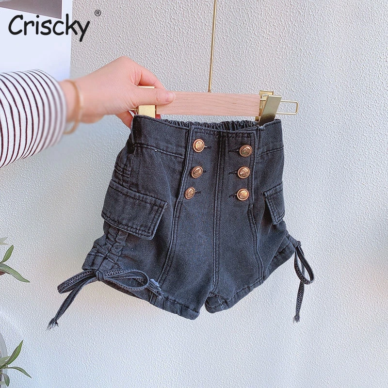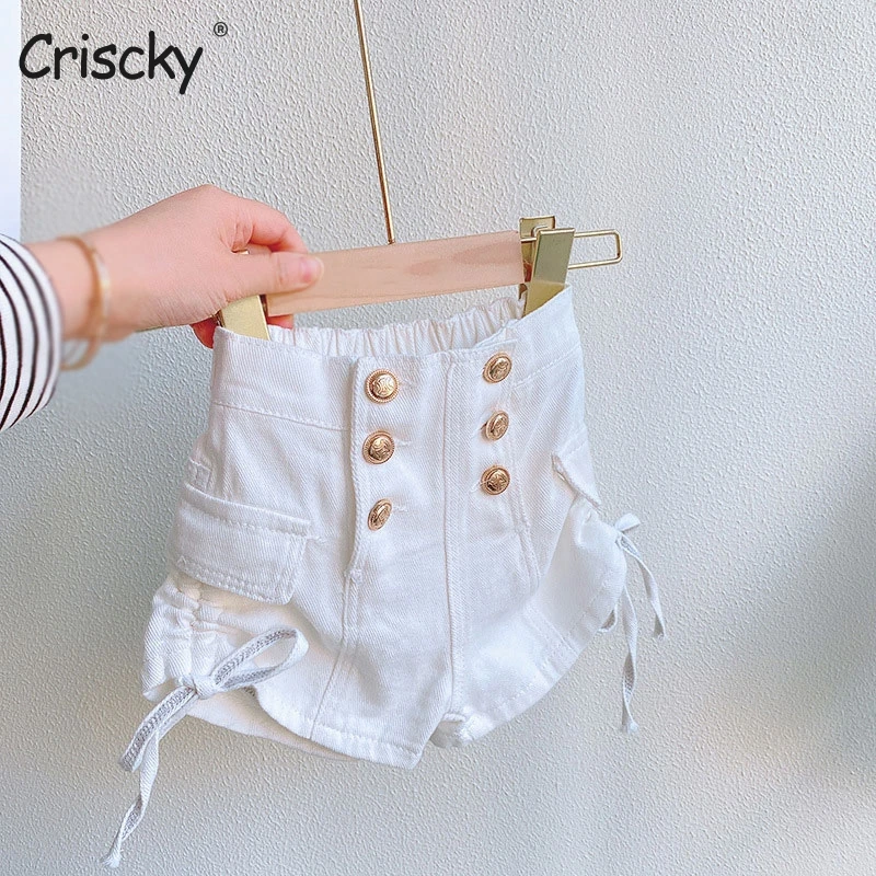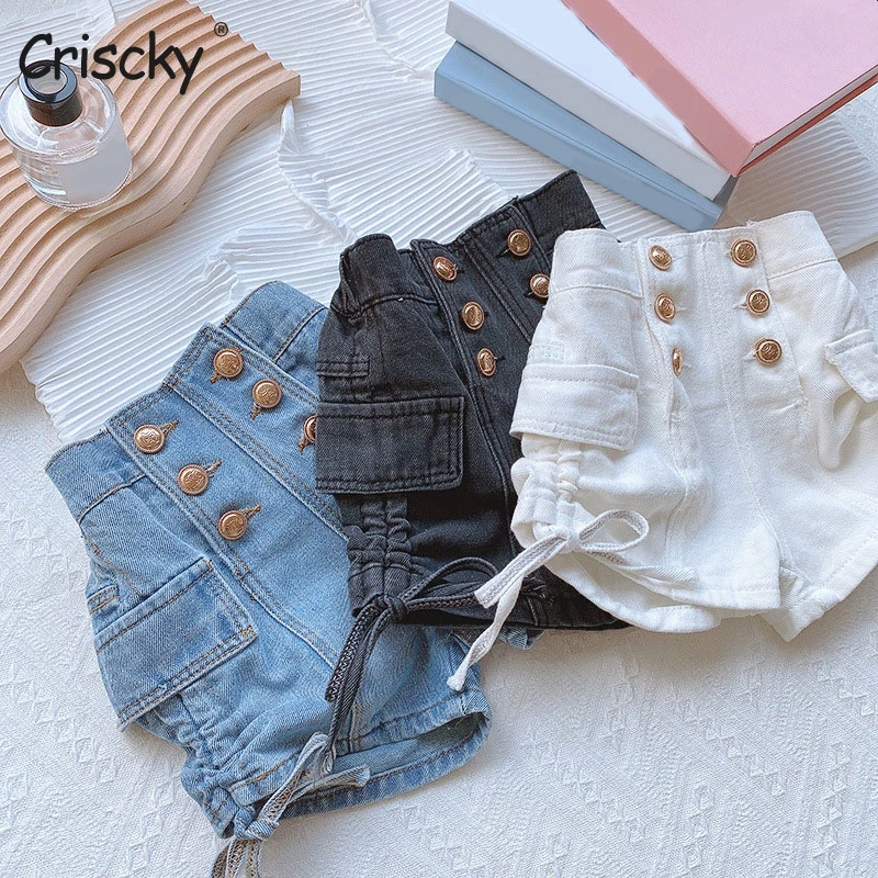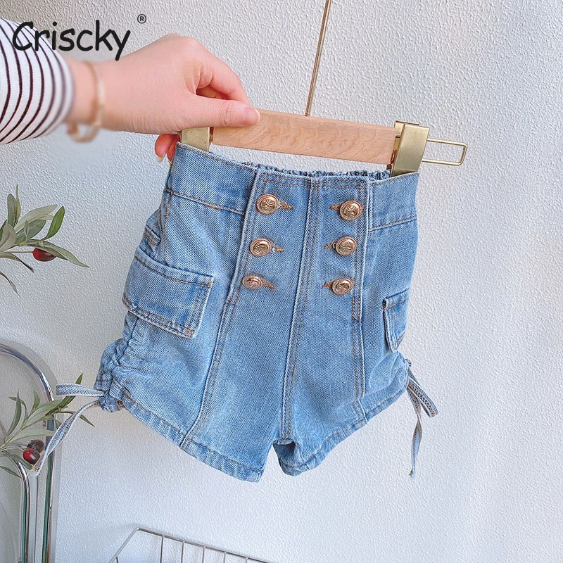 Наименование товара: джинсовые шорты для девочек; Летние шорты с высокой эластичной резинкой на талии и пуговицами для девочек; Детская пляжная одежда; Детские шорты для девочек