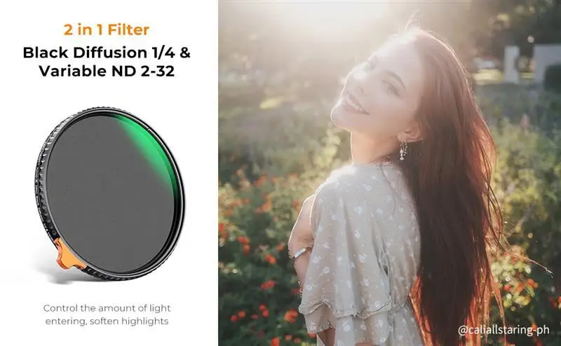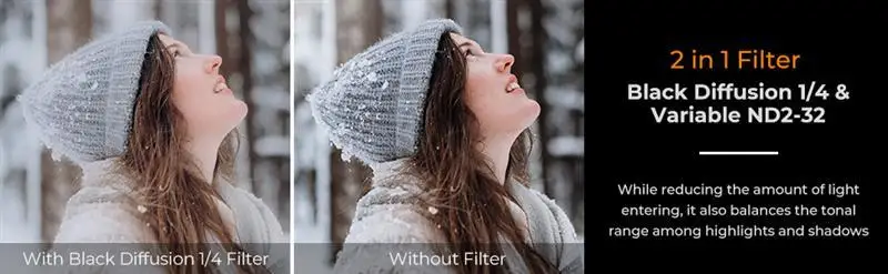 【VND & Black Diffusion Filter1/4 Функция 2 в 1 】 один фильтр имеет ND & Black diffusion 1/4 функции фильтра эффекта, он не только может контролировать количество входящего в светильник объектива с помощью регулировки (1-5 остановок), но и создает кинематографический эффект снов для фотографий и видео.