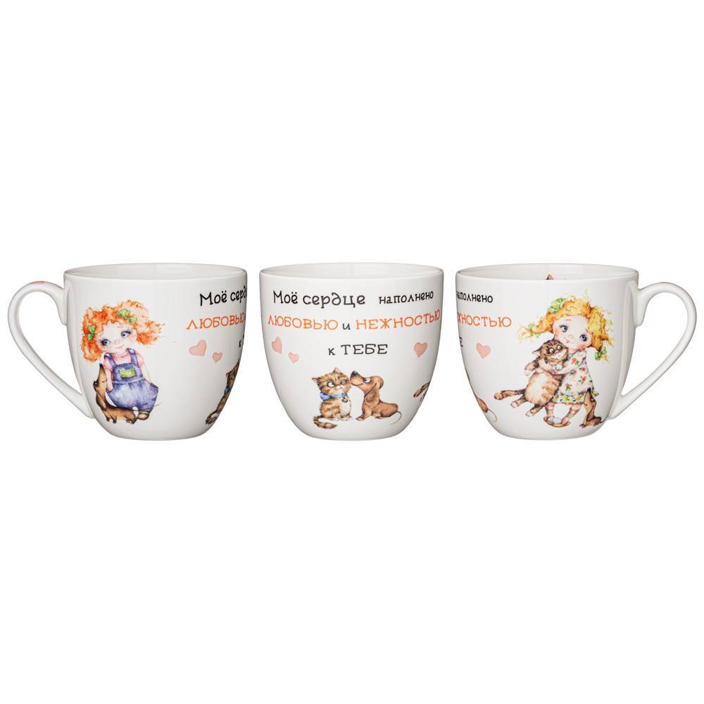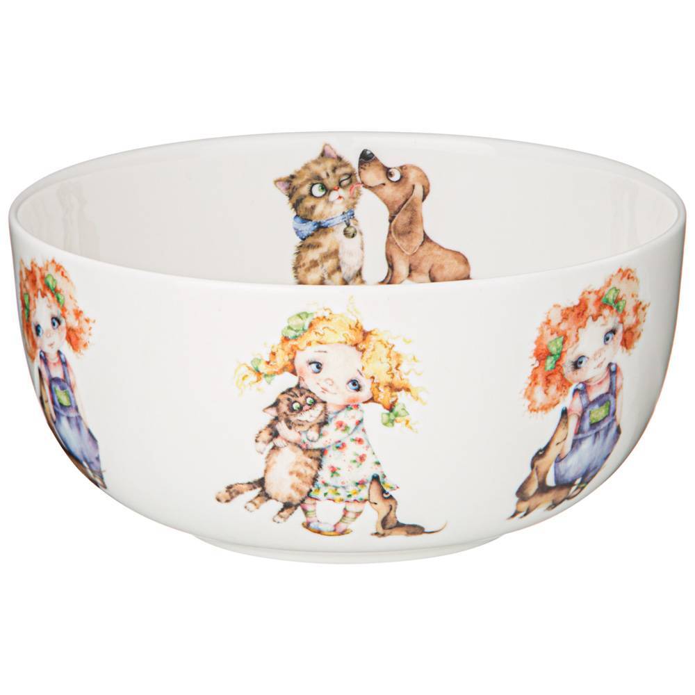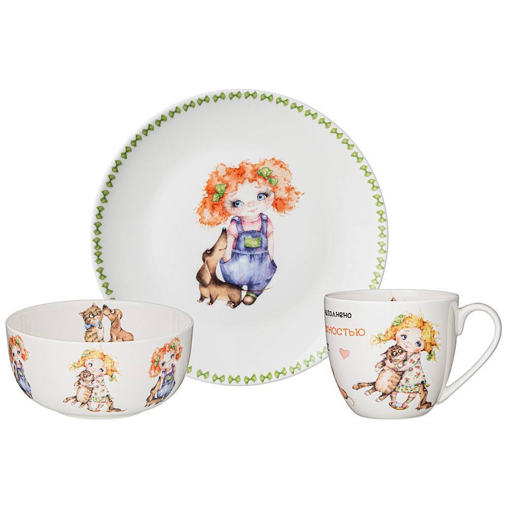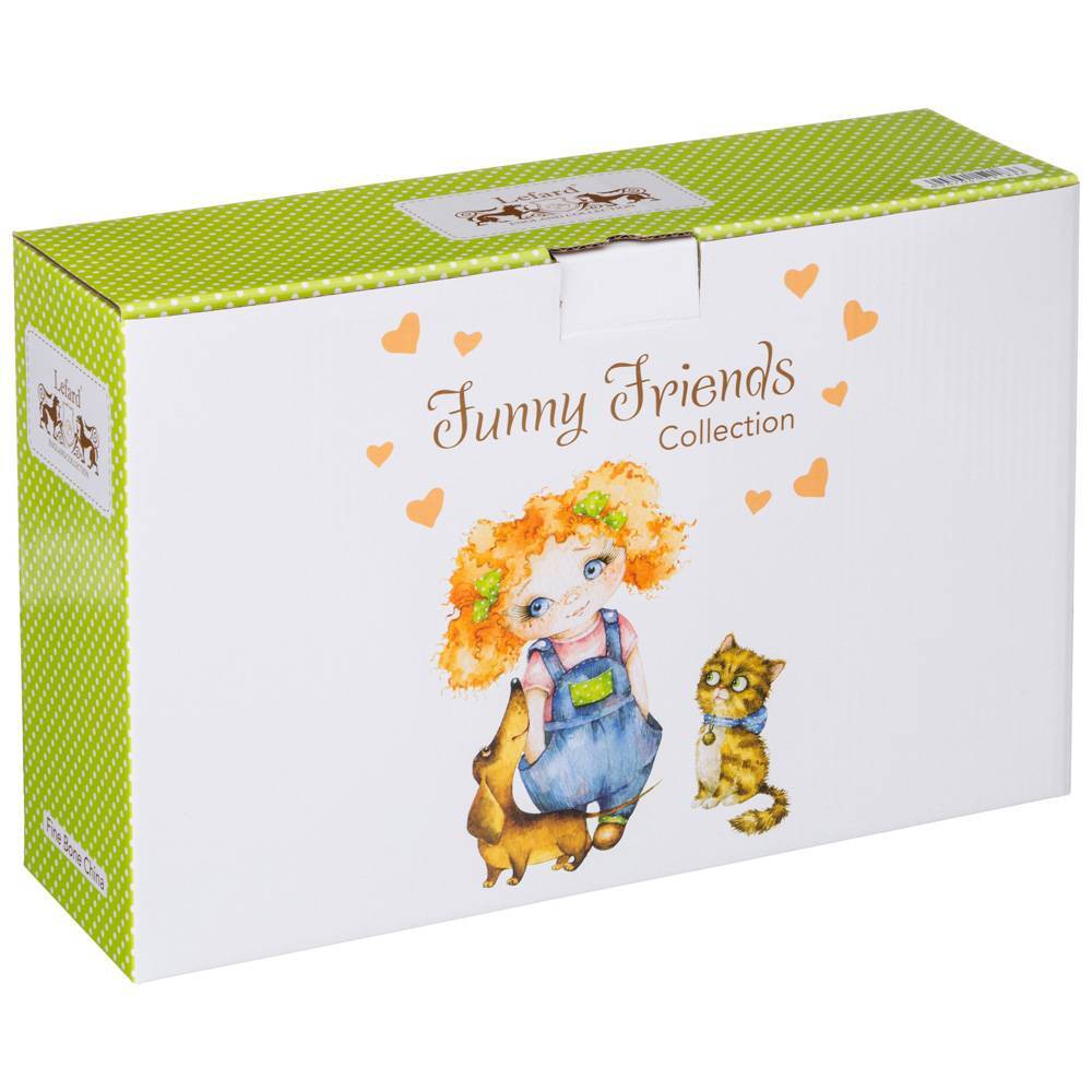 TM Lefard предлагает эксклюзивную авторскую коллекцию посуды "ЛУЧШИЕ ДРУЗЬЯ". Милые девчушки и забавные домашние питомцы на тонкостенном костяном фарфоре понравится любому клиенту от мала до велика. Изделия коллекции сделают прием пищи аппетитным и веселым. Красочная индивидуальная упаковка. Прекрасный подарок для самых любимых, дорогих и любимых детей и подростков. Посуда прошла сертификацию, безопасна для контакта с пищевыми продуктами. Можно ставить в микроволновую печь, мыть в посудомоечной машине. Комплектность - тарелка закусочная -19 см; салатник - 13 см; кружка -380 м