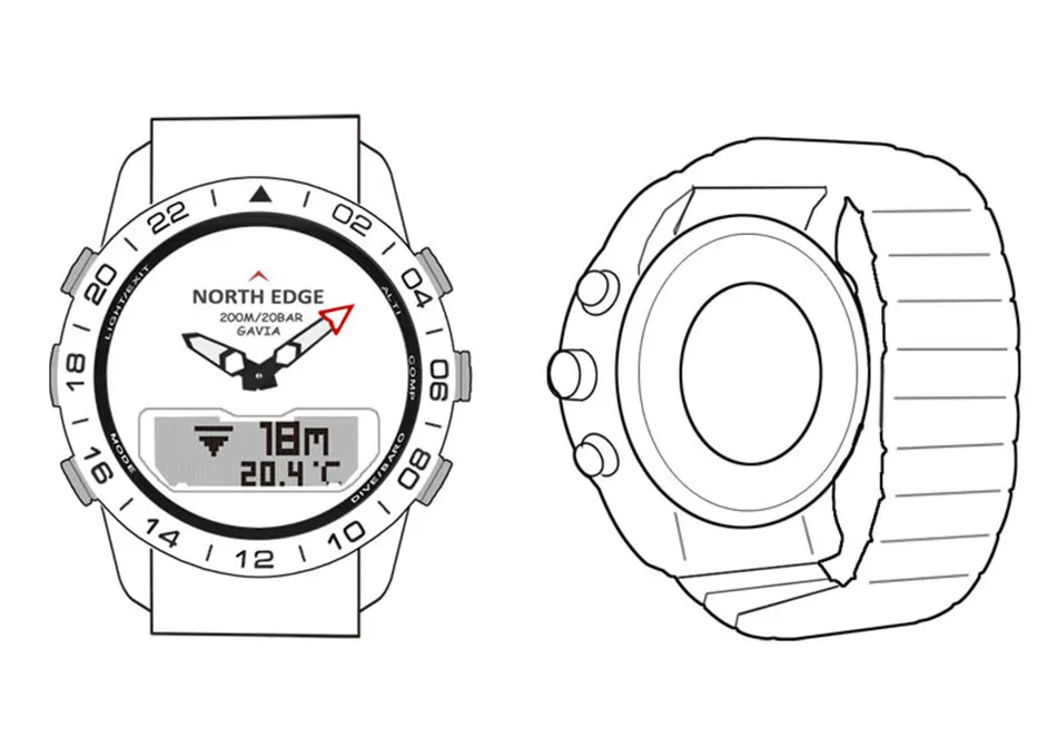 Умные часы North EDGE GAVIA 2 Основная функция: Альтиметр/барометр/Компас/дайвинг/водонепроницаемый 200 м/Двойное время/отсчет/калории/Будильник времени/температура/подсветка/напоминание о низкой мощности/шагомер/Устойчивость к низкой температуре MoreFunction: ● Дата, неделя, два режима отображения времени ● Функция обратного отсчета (99 часов, 59 минут, 59 секунд до 0), ● Функция секундомера (0 ~ 99 часов, 59 минут, 59 секунд, 99,50 наборов петель) ● 2 группы напоминаний о тревоге ● Мировое время, Время восхода и заката, летнее время. ● Высота, может измерять абсолютную высоту и относительную высоту • Барометрическое давление, 24-часовое испытание барометрическое давление кривой, уровнем моря давления, ● Температурная функция, -20 ~ 60 рабочих диапазонов. ● Функция компаса, 16 указателей направления ● Подсчет шагов, устройство для измерения скорости, измерений калорий, запись пройденного Расстояния ● Функция погружения, глубина, температура воды, функция сигнализации глубины ● Максимальная глубина погружения 50 метров ● Подсветка EL, освещается в течение 5 секунд каждый раз Характеристика: 1: Определение кнопки StartButton: A. Высотомер/вверх/старт/стоп B. Барометр/дайвинг/вниз/сброс/переключатель, калибровка компаса C. Измерение компаса М. Время/Настройка/подтверждение/история L. Подсветка/блокировка/возврат Режим сна: в режиме времени, нажмите [L] и [B], чтобы войти в режим сна, режим сна при пробуждении, нажав любую кнопку.