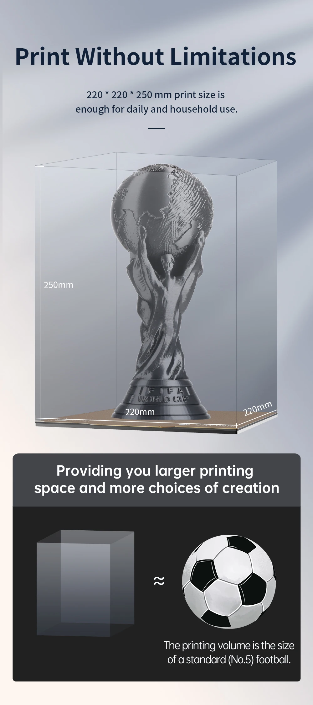 Размер печати 220*220*250 мм достаточно для ежедневного и домашнего использования.