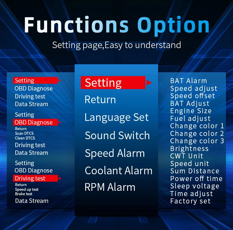 Скорость транспортного средства, температура воды, напряжение, расход топлива, скорость, с переключением между дальним и пройденное расстояние в милях, пройденное расстояние в милях суммарного времени движения транспортного средства, направление движения, количество звезд, количество звезд, контроль над уровнем моря, системное время, давление всасывания, температура масла, воздушно-топливное отношение, турбо давление впускного давления, испытание на ускорение, проверка работы тормозов, Сброс кодов неисправностей, прочитайте поток данных