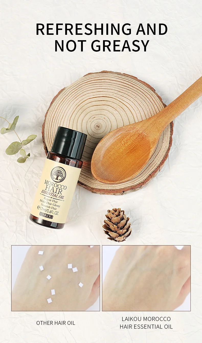 Эффекты: эфирное масло для волос LAIKOU Morocco богато марокканским «жидким золотом» аргановым маслом, которое может восстанавливать поврежденные волосы, разгладьте сухие волосы и создайте защитную пленку для защиты волос от повреждения солнечных лучей и других вредных веществ. Он может эффективно восстанавливать чешуйки волос и обеспечивать питательные вещества, чтобы сделать волосы гладкими и шелковистыми.