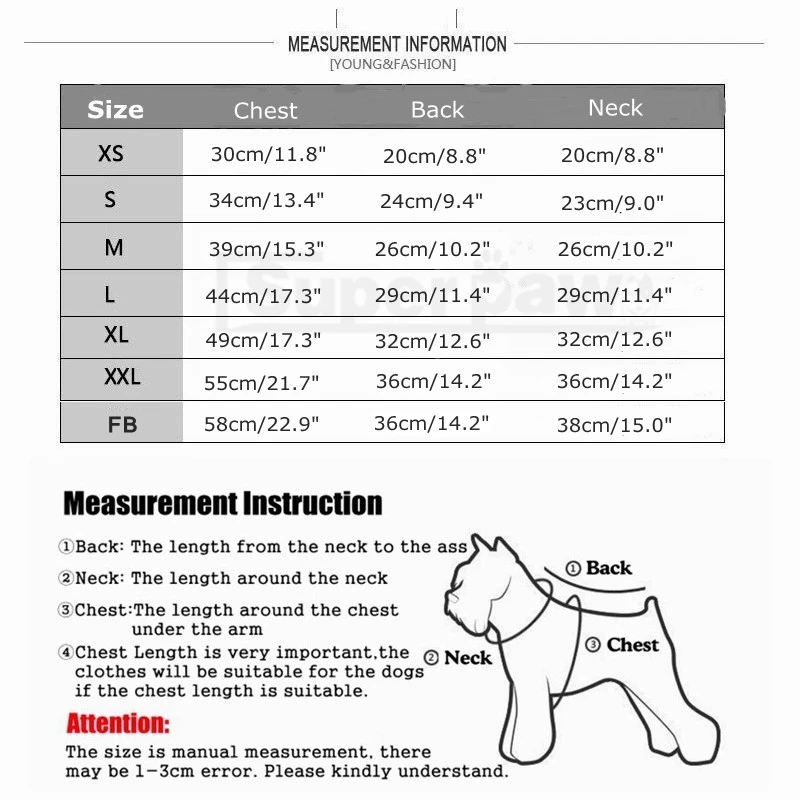 1. Пожалуйста, проверьте вашего питомца замеры изделий сделаны вручную, поэтому убедитесь в том, что одежда подходит для домашних животных перед тем, как вы заказываете (1 дюйм = 2,54 см)