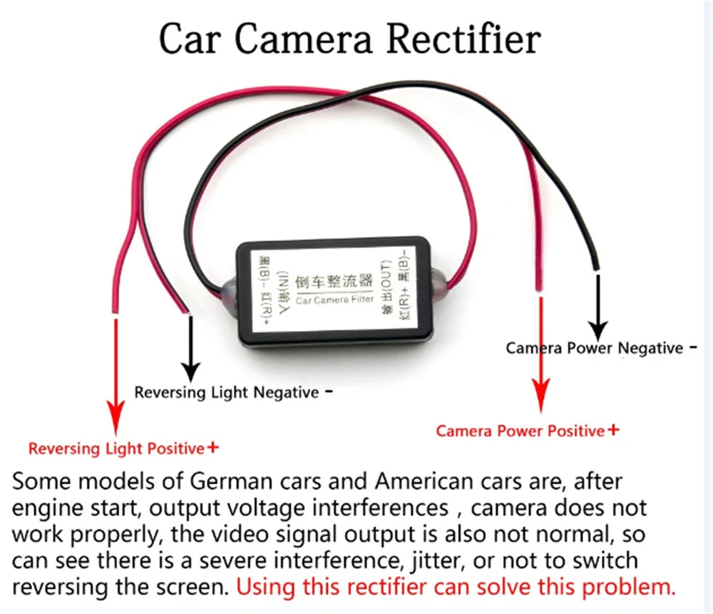 Некоторые немецкие и американские модели автомобилей, после запуска двигателя, помехи выходного напряжения, источник питания на светильник заднего хода s не является чистым источником питания постоянного тока, но питание камеры получает от автомобиля светильник заднего хода, поскольку рабочее напряжение нестабильно, камера не может работать должным образом, выход видеосигнала также не является нормальным, Таким образом, из автомобильного блока, мы могли видеть, что есть серьезные помехи, дрожание, или не могли переключиться на реверсивный экран.