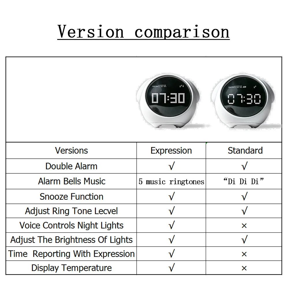 8. Температура дисплея: не обновленная версия: 1. Количество будильников: 2 группы будильников 2. Мелодии звонка: 5 видов мелодий 3. Функция повтора: ДА 4. Регулировка громкости: Да 5. Управление звуком: Да 6. Регулировка яркости: да 7. Выражение: Да 8. Температура дисплея: Да