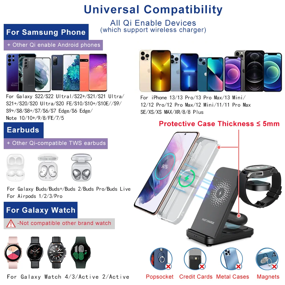 【 3 в 1 Беспроводное зарядное устройство:Беспроводная зарядная станция может заряжать ваш для Galaxy 4/3/Active 2/active【не для Apple Watch】, Galaxy Buds/Buds +/Buds Pro/Buds Live, телефоны одновременно, такие как для Samsung Galaxy S22/S21/S20/S10/S9 серии iPhone 13/13 Pro/13 Pro Max/13 Mini/12/12 Pro/12 Pro Max/12 Mini/11/11 Pro/11 pro Max/SE/8/8 plus, И все Qi-сертифицированные устройства. Попрощайтесь с грязными шнурами, делает ваш стол и тумбочку аккуратно и организованно. Для лучшей зарядки Используйте адаптер питания QC 3,0 (не входит в комплект).