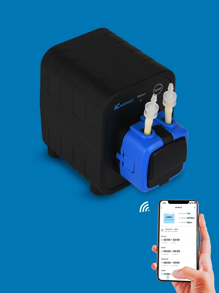 Kamoer X1 PRO помпа-дозатор для жидкости-Новейший Современный управляемый помпа-дозатор для жидкости от Kamoer. Каждый X1 PRO интегрирован с WiFi для полного управления через мобильное устройство (iPhone или Android). Простое в использовании приложение интуитивно настраивает один или несколько насосов X1 PRO на любой желаемый режим дозирования.