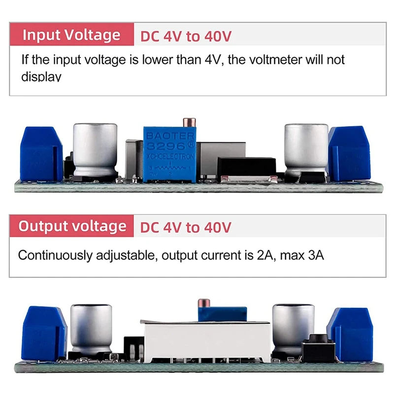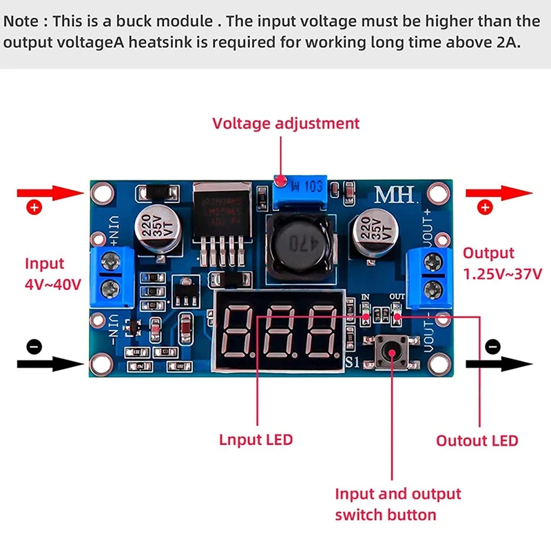 Примечание: Это понижающий модуль. Интерфейсы ввода и вывода не могут быть изменены. Входное напряжение должно быть выше, чем выходное напряжение. Радиатор необходим для длительной работы более 2А/15 Вт. В первый раз, вам нужно повернуть потенциометр более чем в 10 раз против часовой стрелки.