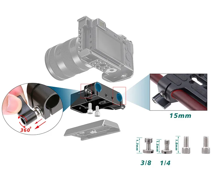 Продукт разработан с богатыми расширительными отверстиями, с 1/4 3/8 отверстиями для позиционирования ARRI и многими 1/4 отверстиями соответственно. Нет давления для установки Расширительных аксессуаров;