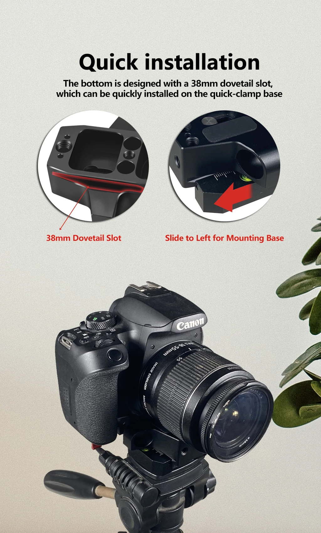 Нижняя часть выполнена с канавкой для штатива 38 мм, которая может быть быстро установлена на Быстрозажимной основе, как штатив;