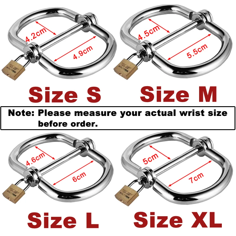 -Цвет наручников: серебристый -Цвет замка: желтый -Материал: нержавеющая сталь Размер: -Размер S: 4,2*4,9 см -Размер M: 4,5*5,5 см -Размер L: 4,6*6 см -Размер XL:5*7 см Примечание: Перед покупкой Измерьте фактический размер запястья. (Мы не несем ответственности за товар, не подходящий для неправильного размера, приобретенного покупателем!)