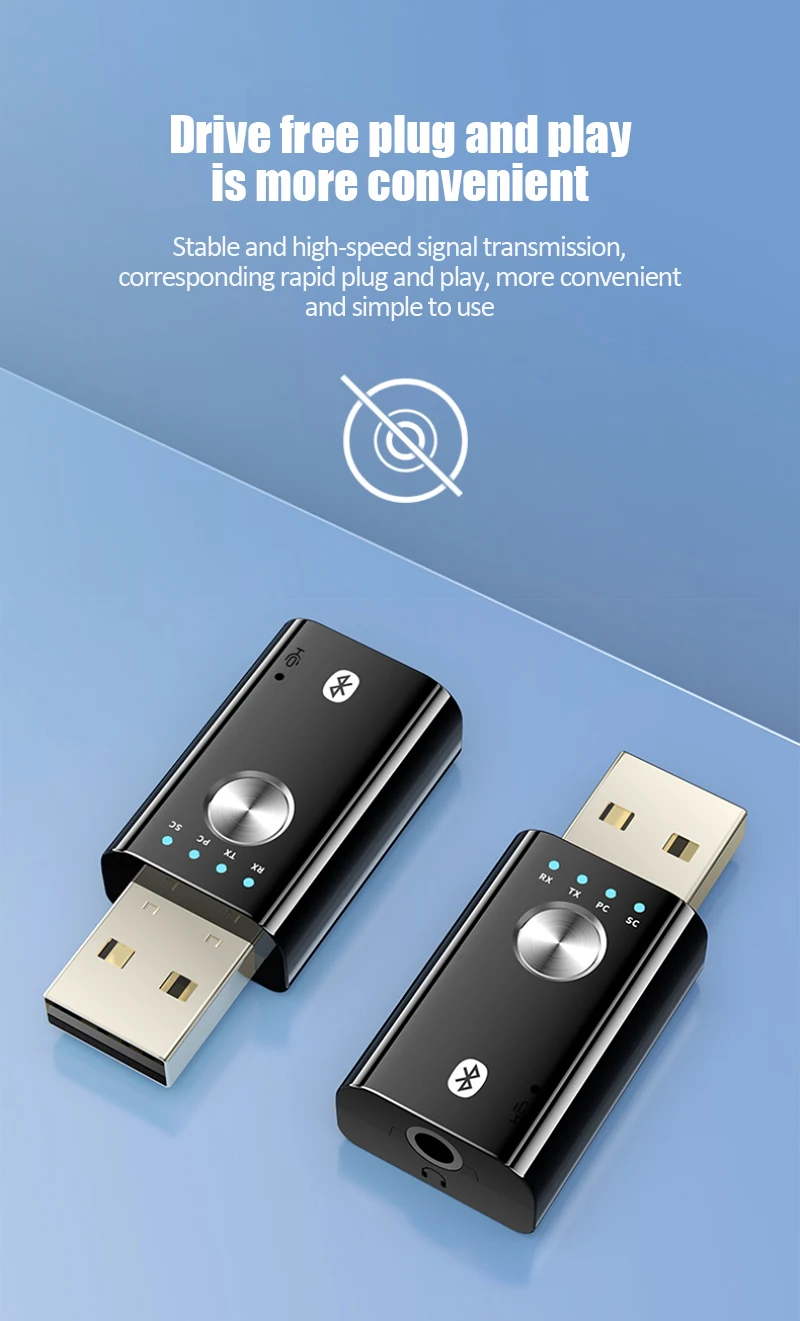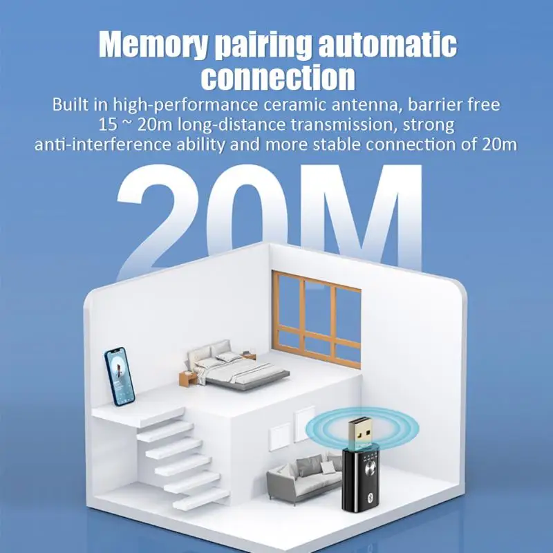 2. Режим аудиопередатчика ПК: Беспроводная передача звука с ПК, ноутбука на bluetooth-гарнитуру или динамик через порт USB, аудиокабель не требуется.