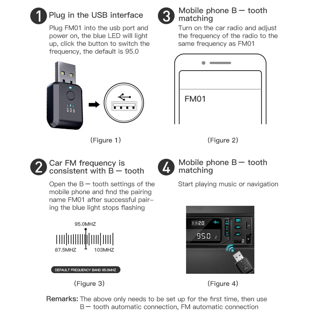 * 2. Установите fm-частотный диапазон, нажав на кнопку, затем включите автомобильное радио и настройте fm-частотный диапазон радио так же, как у FM01.