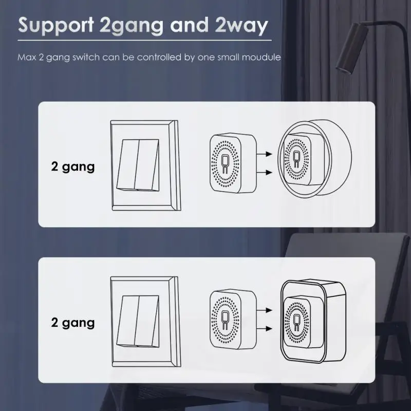 2-канальный умный модуль переключателя Wi-Fi можно установить за кассетой переключателя для управления 2-канальным переключателем или управления 2-светильник почками. Он поддерживает два способа одновременного включения и выключения, включения и выключения неумных ламп или переключения в интеллектуальное управление, синхронизации и голосового управления (Alexa, Google assistant,Yandex Alice) И совместное использование, функции группового управления. В то же время, он также может создавать умные сцены с другими умными устройствами в приложении для достижения связи сцены. (Приложение: Smart Life/Tuya smart)