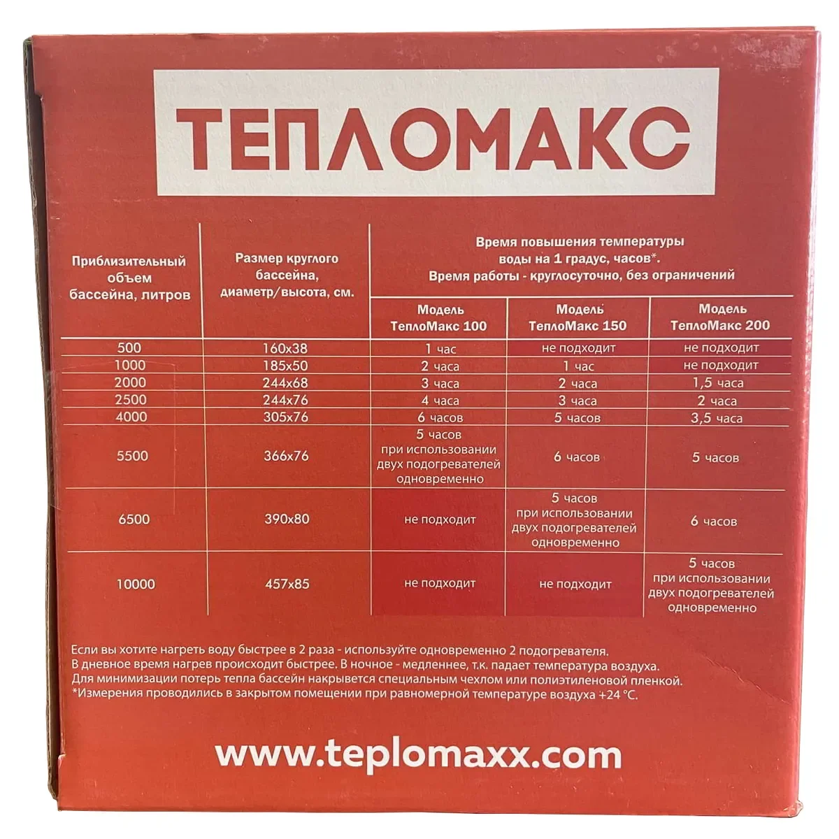 Повышает температуру воды на 10-15 °C. Электронагреватель рассчитан на увеличение температуры воды на 10-15 °C в бассейне с объемом воды до 2000 литров. На прогрев максимального объема воды в бассейне потребуется, примерно, 24 часа.