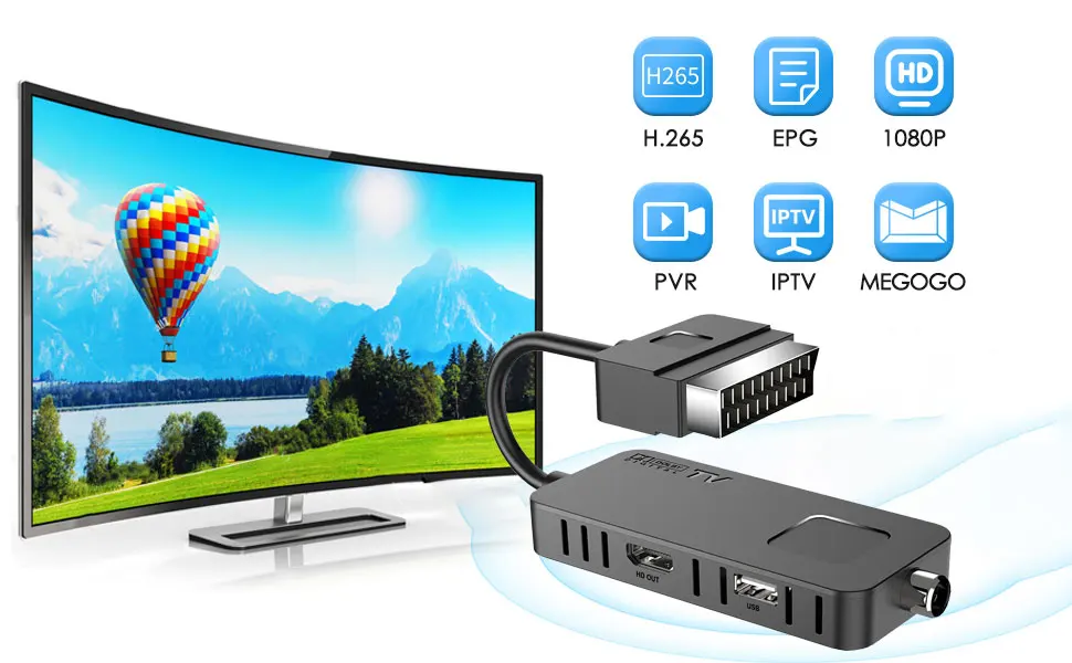 Декодер телевизора предназначен для скрытия за вашим телевизором, Встроенный кабель scart упрощает использование. Вы также можете наслаждаться видео full HD 1080P с помощью кабеля HDMI (в комплекте).