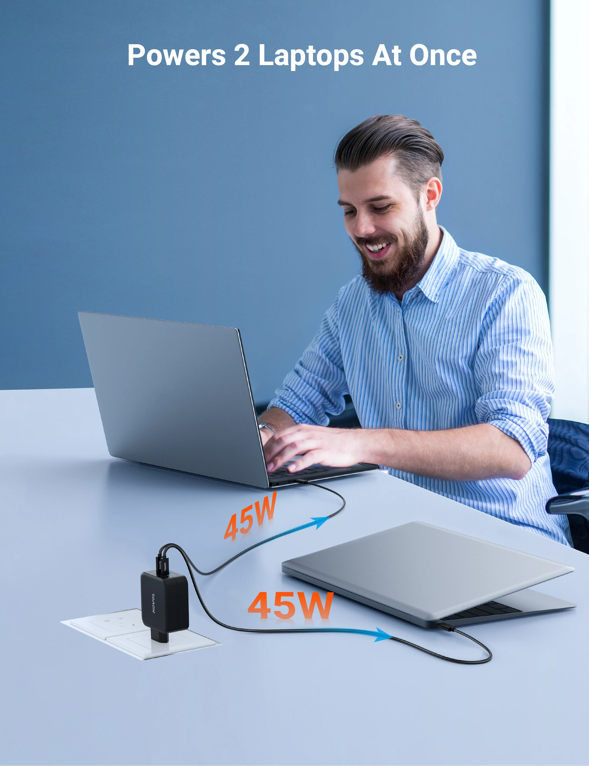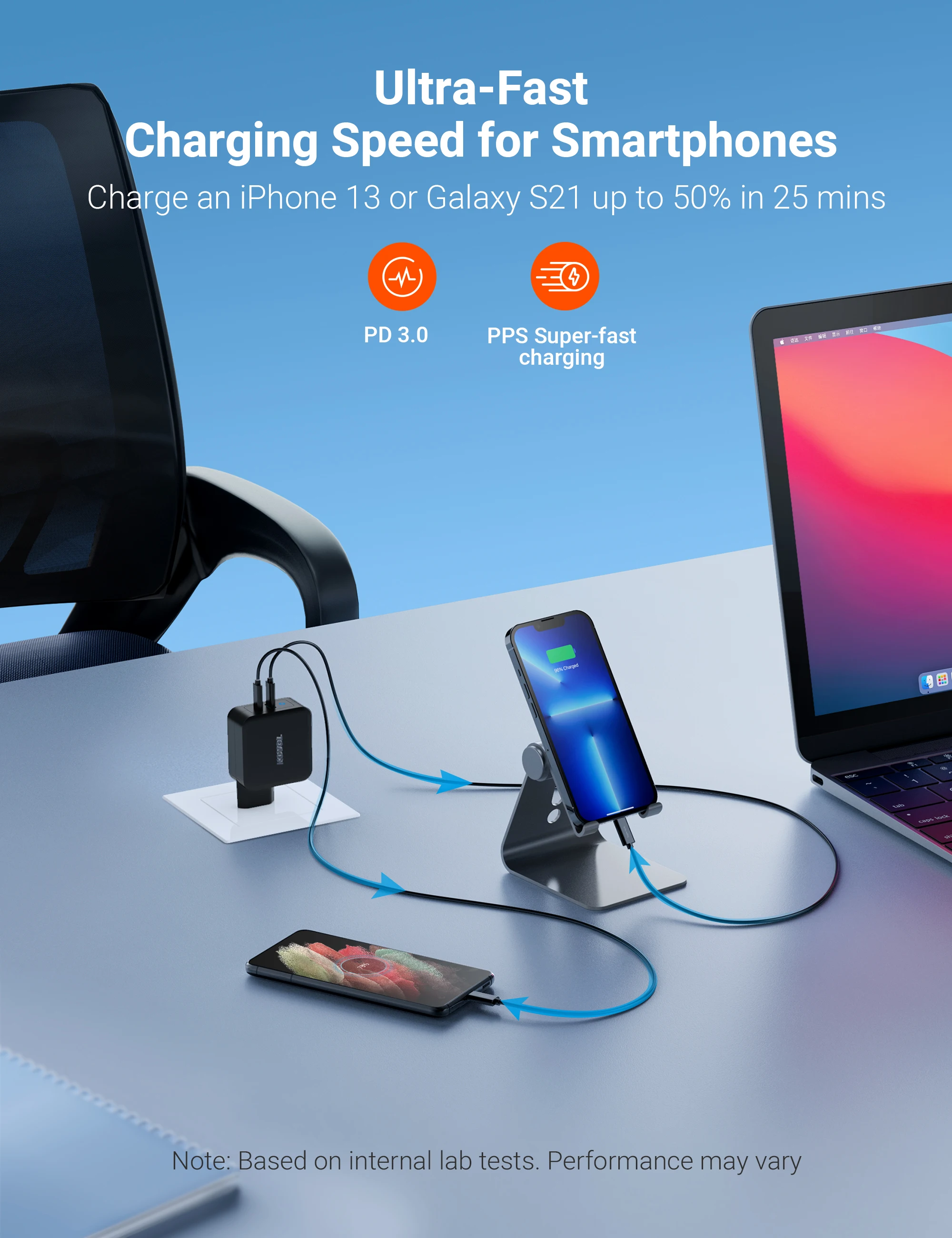 Двойной выход 45 Вт может одновременно заряжать MacBook Air и Dell XPS 13, в то время как PD 3,0 и 25 Вт PPS протоколы зарядки предлагают необыкновенную высокоскоростную зарядку для голодного MacBook Pro 13 ",iPhone 13,Galaxy S21 и многое другое.