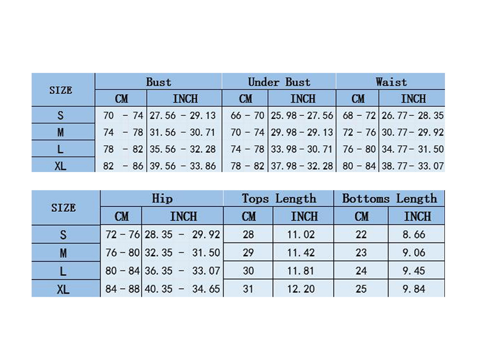 Размеры Американский размер Размер Великобритании Европейский размер Бюст Под грудью Талия Бедра Длина верха Длина низа S 4 8 32 70-74 см/27,56-29,13'' 66-70 см/25,98-27,56'' 68-72 см/26,77-28,35 дюйма 72-76 см/28,35-29,92 дюйма 28 см/11,02'' 22 см/8,66'' М 6 10 34 74-78 см/29,13-30,71 дюйма 70-74 см/27,56-29,13'' 72-76 см/28,35-29,92 дюйма 76-80 см/29,92-31,50'' 29 см/11,42'' 23 см/9,06'' L 8 12 36 78-82 см/30,71-32,28'' 74-78 см/29,13-30,71 дюйма 76-80 см/29,92-31,50'' 80-84 см/31,50-33,07'' 30 см/11,81'' 24 см/9,45'' XL 10 14 38 82-86 см/32,28-33,86'' 78-82 см/30,71-32,28'' 80-84 см/31,50-33,07'' 84-88 см/33,07-34,65'' 31 см/12,20'' 25 см/9,84''