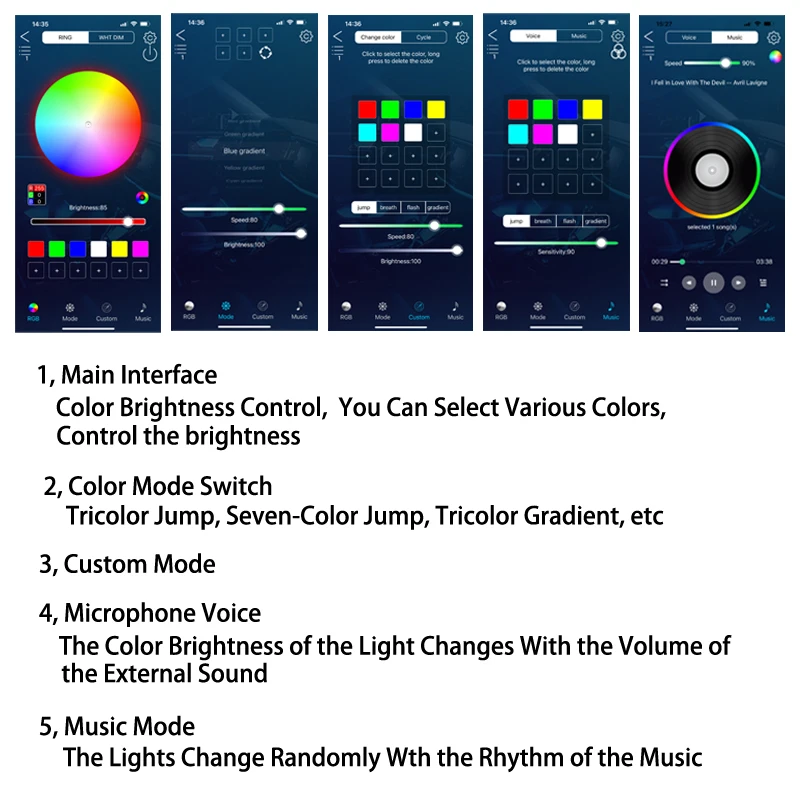 1) активные звуковые эффекты: светодиодный индикатор под системой яркости автомобиля оснащен звуковыми датчиками, которые позволяют синхронизировать светодиодный индикатор с музыкальным ритмом. Светодиодный светильник с музыкальной полоской следит за ритмом и настраивает мерцание, чтобы адаптироваться к силе звука.