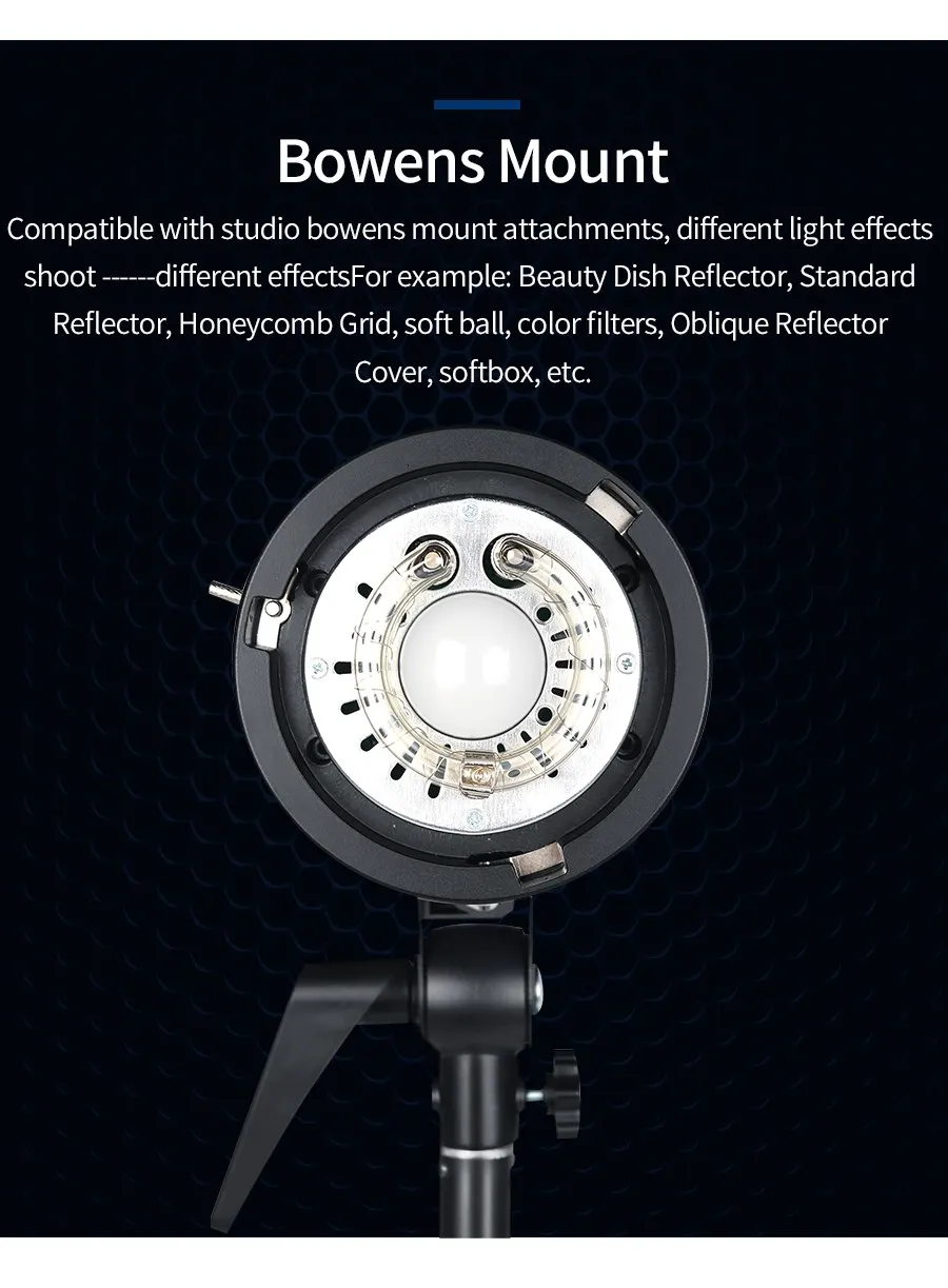 Спасибо за выбор студийной вспышки серии DEII. Это прочный и качественный стробоскоп с полными функциями, помогающий фотографам создавать желаемые световые эффекты. Продукт подходит для свадьбы, портрета и фотографии товара.