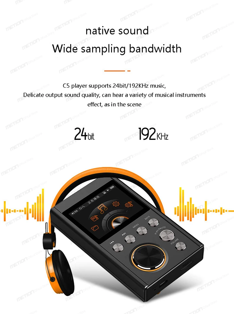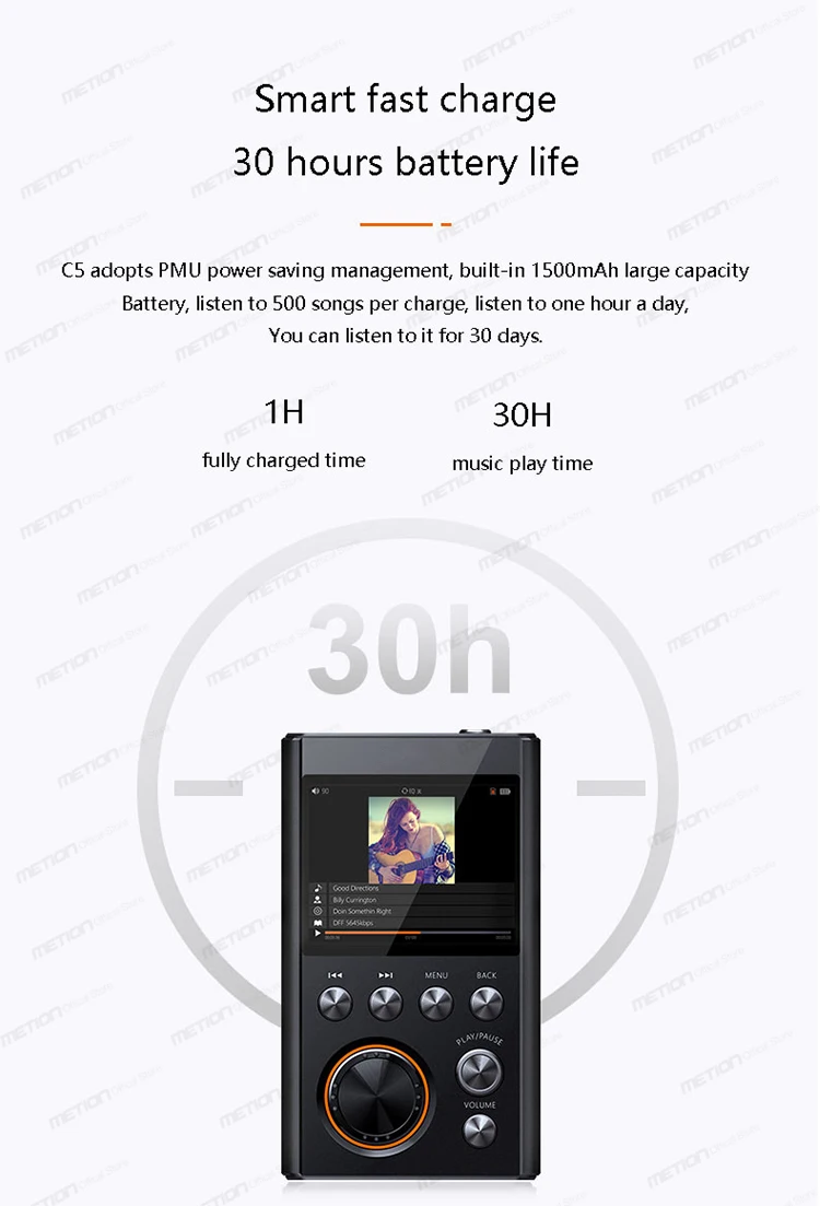 Это отличный профессиональный Hi-Fi плеер MP3 предназначен для меломанов с металлическим чехол. C5s поддерживает DC digital (DSD 64), 24 бит/192 кГц, полноформатное декодирование, корпус плеера не имеет встроенной памяти, максимальная карта TF 128 ГБ может расширить память, 2,0-дюймовый TFT экран, полностью заряженный может играть в течение 30 часов, профессиональная MIPS + DSP архитектуры.
