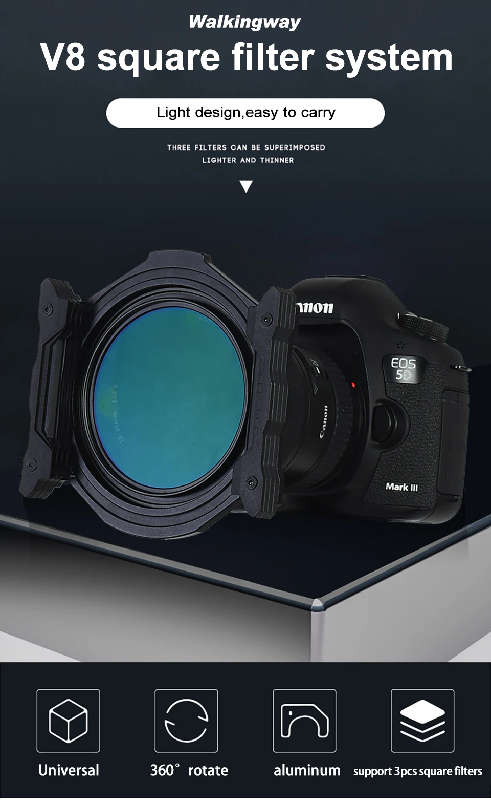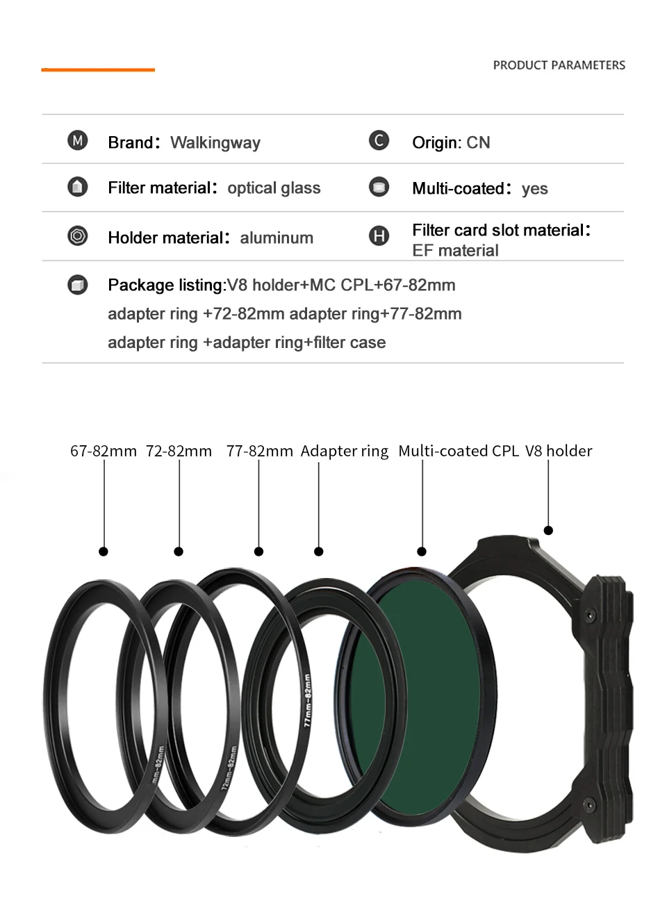 Набор кольцевых держателей Walkingway V8, включает в себя 86 мм HD с многослойным покрытием CPL,77-82 мм переходное кольцо, 72-82 мм переходное кольцо, 67-82 мм переходное кольцо, держатель V8, этот набор весит всего 360 г, легко носить с собой, он также имеет прекрасное качество и конкурентоспособную цену.HD с многослойным покрытием CPL
