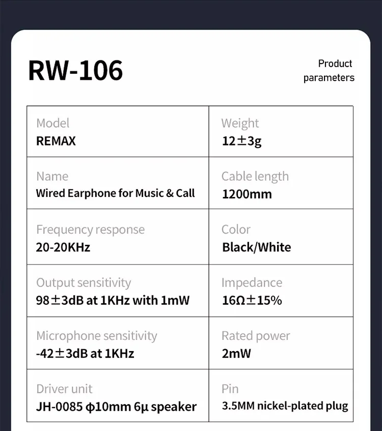 Проводные наушники REMAX для звонков и прослушивания музыки RW-106 Спецификация| Название продукта | Проводные наушники REMAX для звонков и прослушивания музыки RW-106 |