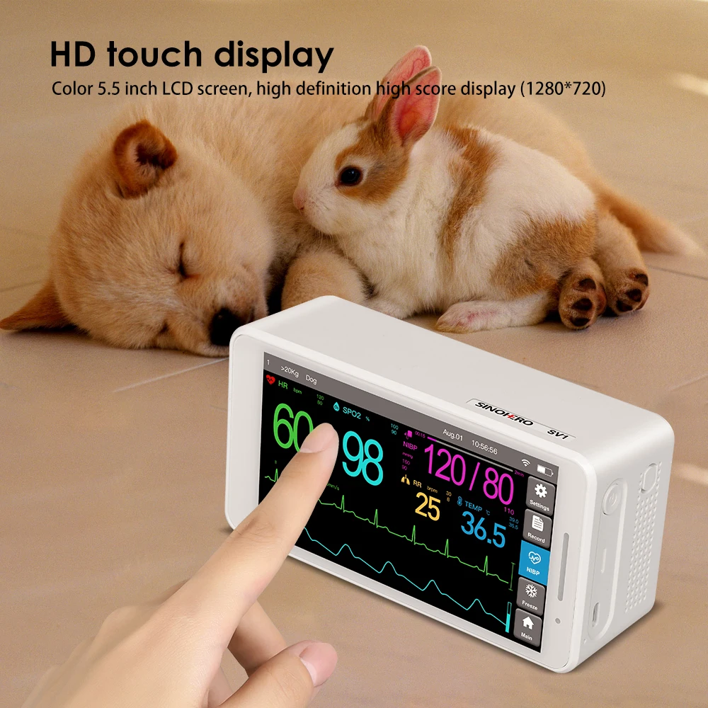 Ветеринарный монитор, он разработан, чтобы быть полностью ветеринарной специфической системой, используется для мониторинга кошек, собак и других крупных животных. Он уникально развивает технологию SpO2, NIBP и ECG для ветеринара, обеспечивает хорошее чтение и точность во время различных ситуаций от больших до маленьких животных.