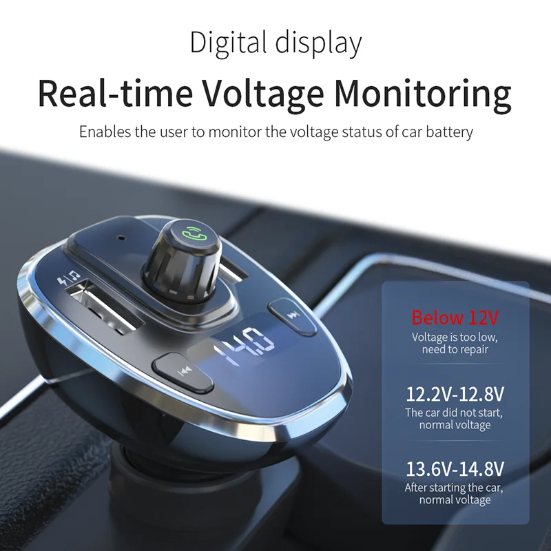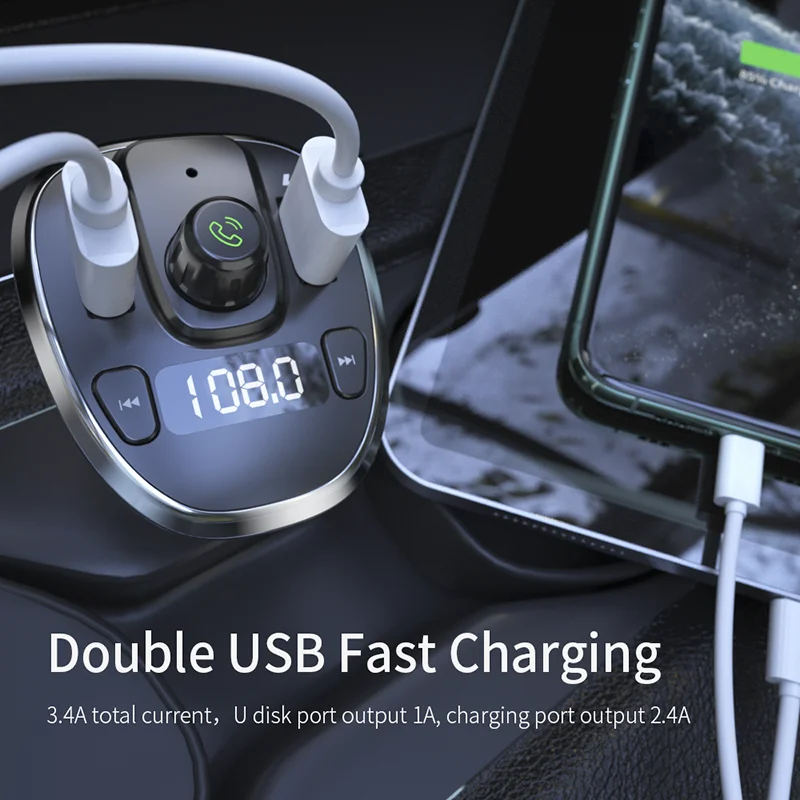 Автомобильное зарядное устройство Essager Bluetooth 5,0 FM TransimitterОсобенности-Подключение Bluetooth 5,0 для воспроизведения-Телефонные звонки без рук-Двойной выход USB 5 В/3,4 A (макс.)-Светодиодный дисплеер-FM частота: 87,0-108 МГц-Дальность излучения FM: 5 м (макс.)-Расстояние Bluetooth: 10 м (макс.)-Емкость: tf-карта/u-диск ≤ 32G-ВыходUSB 1: DC 5V / 2.4A MaxUSB 2: DC 5V / 1A Max-Вход-12-24 В