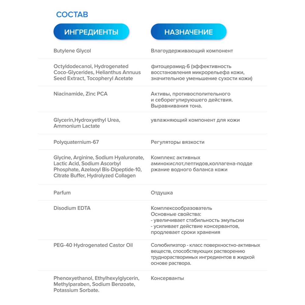 | Состав | Aqua, Butylene Glycol, Glycerin, Sodium PCA, Hydroxyethyl Urea, Ammonium Lactate, Hydrolyzed Collagen, PEG-40 Hydrogenated Castor Oil, Trideceth-9, Polyquaternium-67, Parfum, Lactic Acid, Glycine, Arginine, Sodium Hyaluronate, Sodium Ascorbyl Phosphate, Azelaoyl Bis-Dipeptide-10, Citrate Buffer, Octyldodecanol, Hydrogenated Coco-Glycerides, Helianthus Annuus Seed Extract, Tocopheryl Acetate, Disodium EDTA, Phenoxyethanol, Ethylhexylglycerin, Sodium Benzoate. |