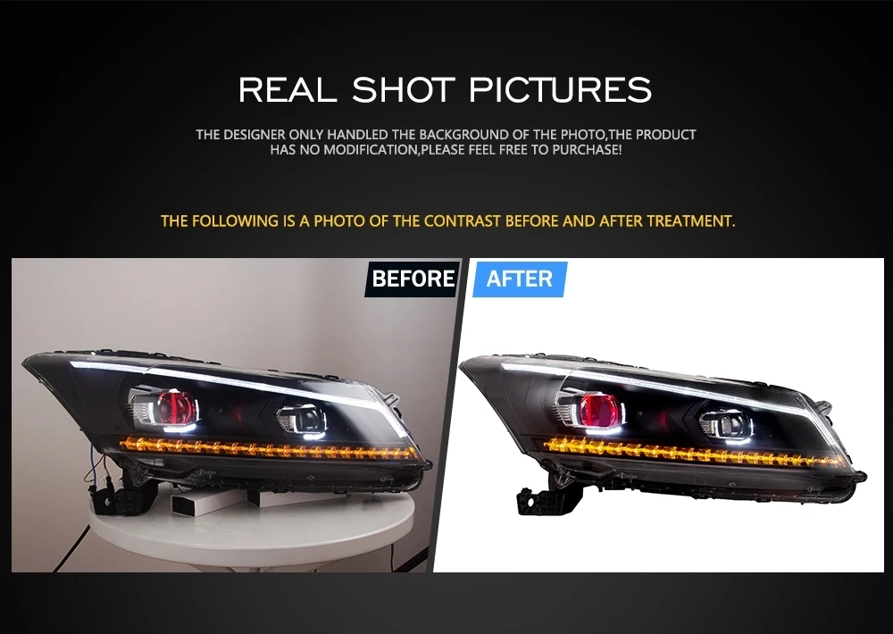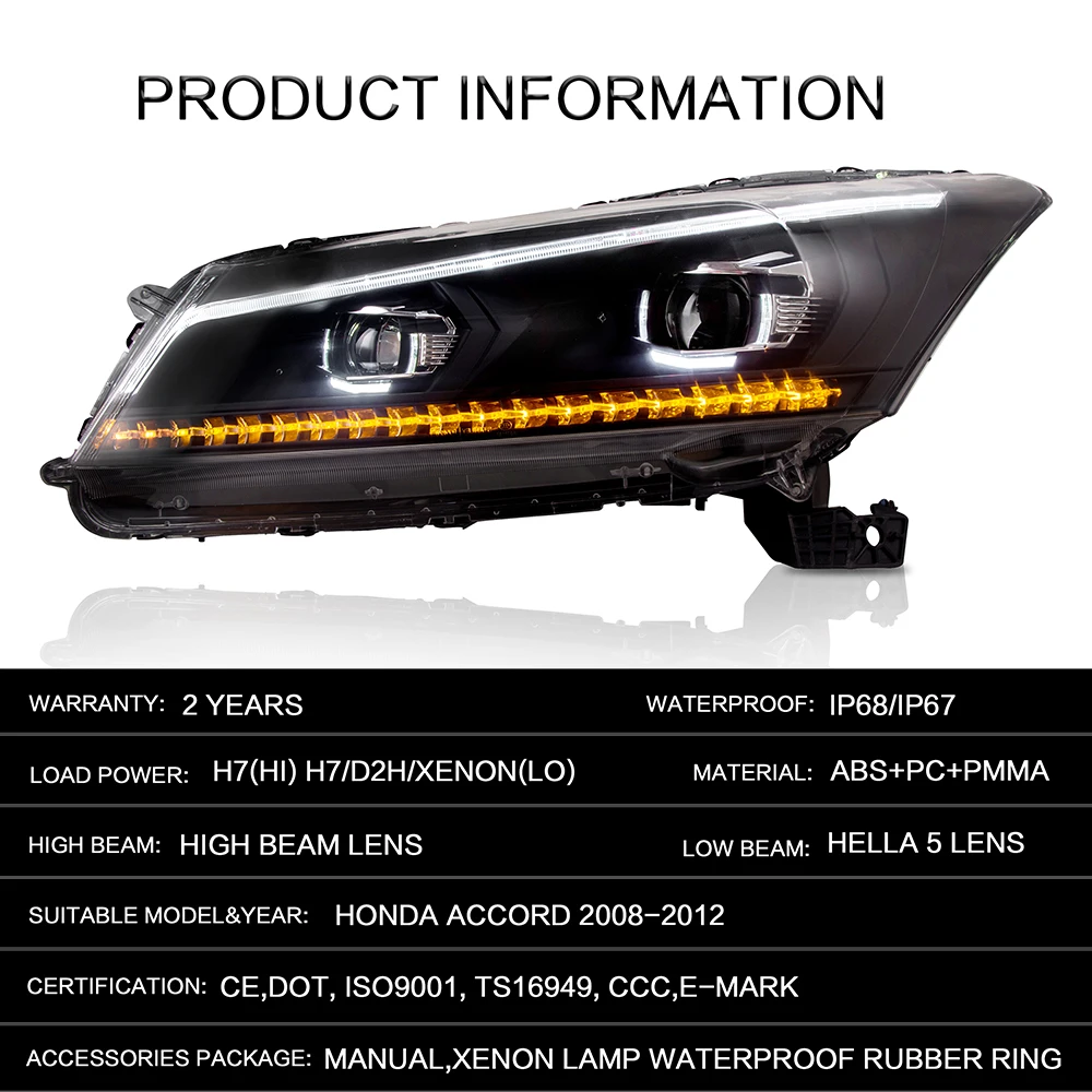 Водонепроницаемость: IP68/IP67 Материал: ABS + PC + PMMA Дальний свет: объектив дальнего света Ближний свет: объектив Hella 5 Мощность нагрузки: H7(H1)h7/D2H/XENON(LO) Подходящая модель и год: Honda Accord 2008-2012