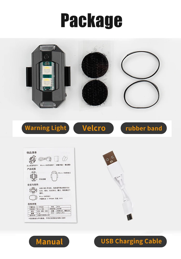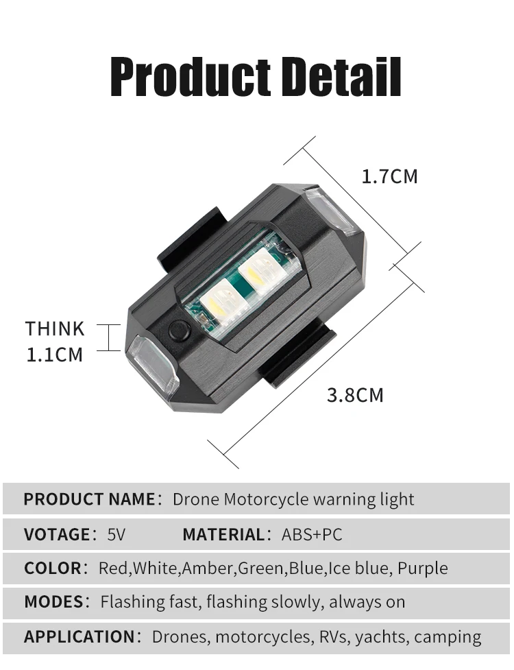 Дроны, например, DJI Mavic 3, DJI Air 2S, Mini 2, Mavic Air 2, Mavic Pro, FPV, Holy Stone, Phantom, Inspire, Matrice. Кроме того, освещение для предотвращения столкновений может также использоваться для наружного использования, кемпинга, велосипеда, шлема, скейтборда и мотоцикла, автомобиля, RV, яхты.