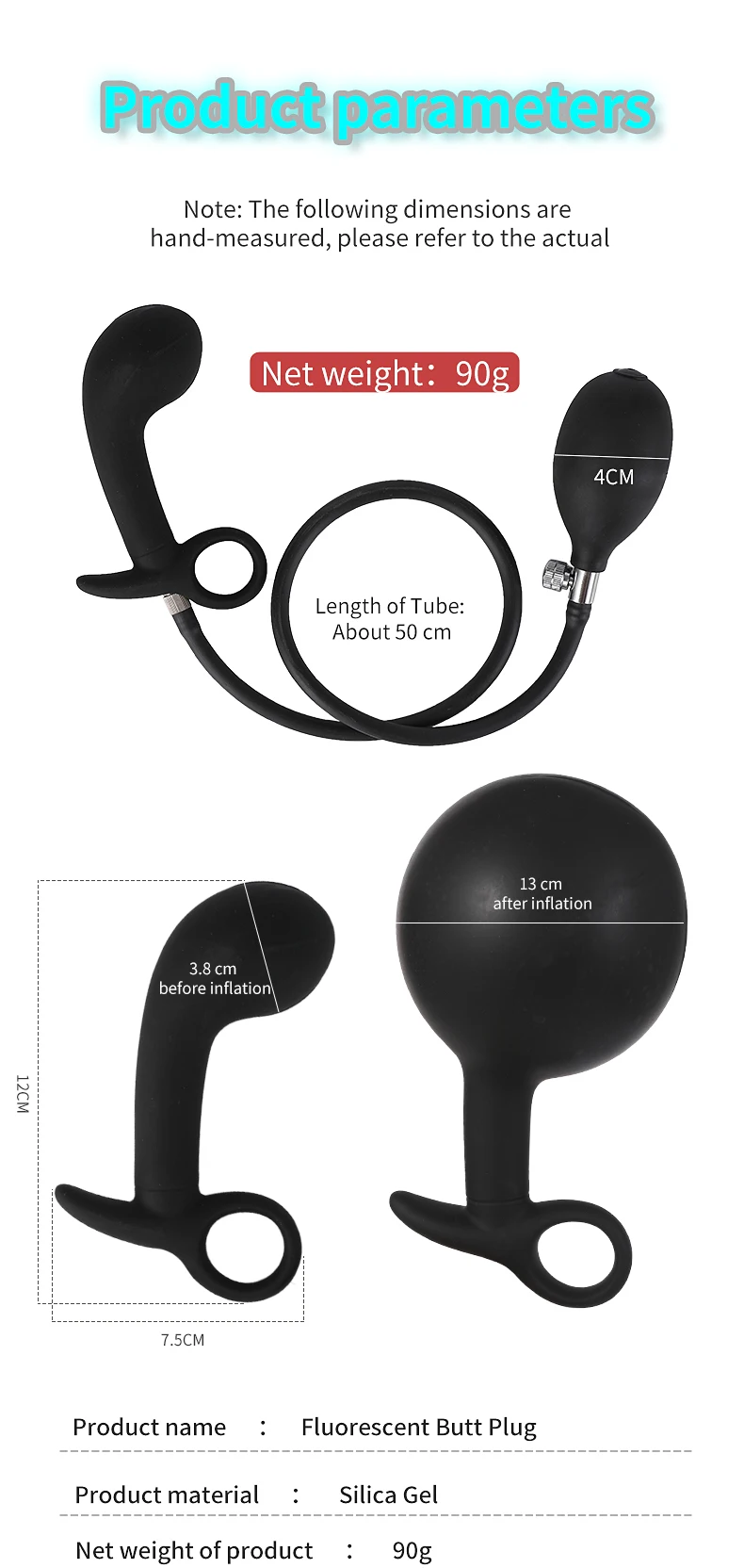 Функция продукта:Светится в темноте; 13 см максимальный диаметр надувной; Изменяемый размер; Предотвращение падения тянуть кольцо; Разделяемый дизайн (Анальная пробка и надувной насос могут быть отклонены)