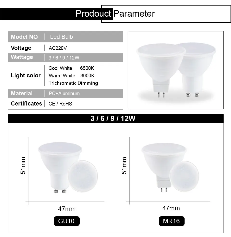 10 шт./лот светодиодная точечная лампа GU10 Светодиодная лампа 12 Вт 9 Вт 6 Вт 3 Вт Светодиодная лампа 220 В прожектор MR16 7 Вт лампада GU5.3 кукурузная лампа gu 10 ампул