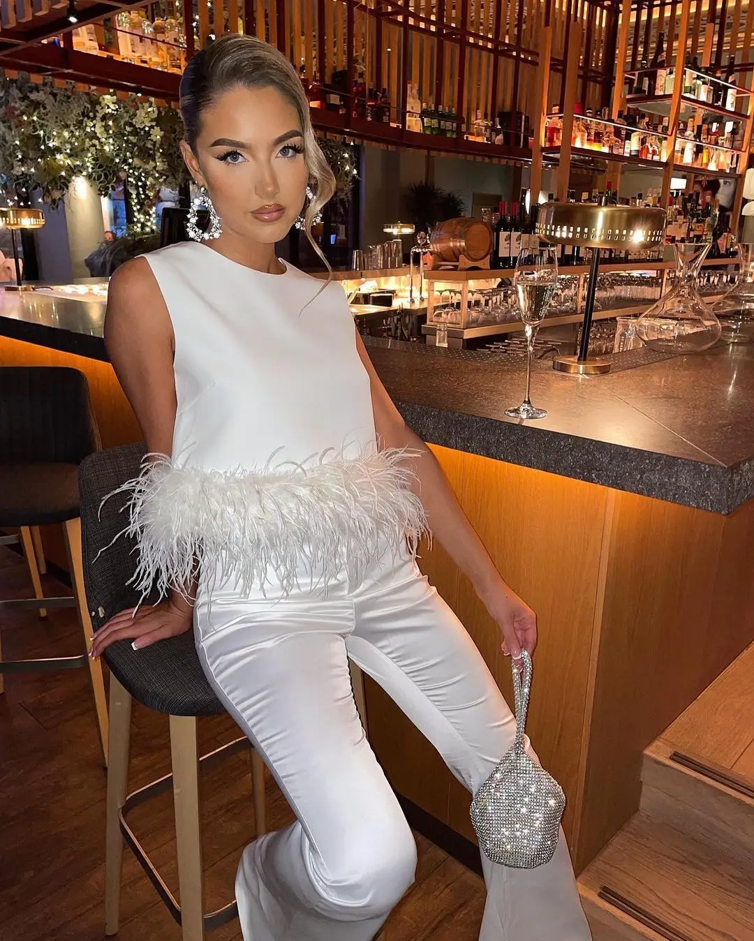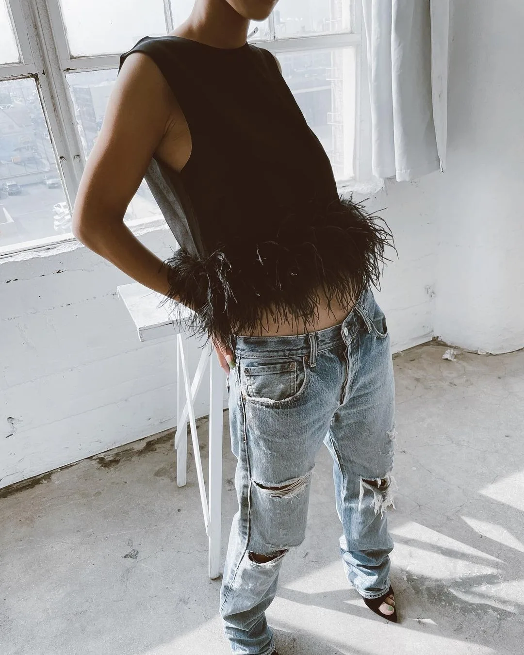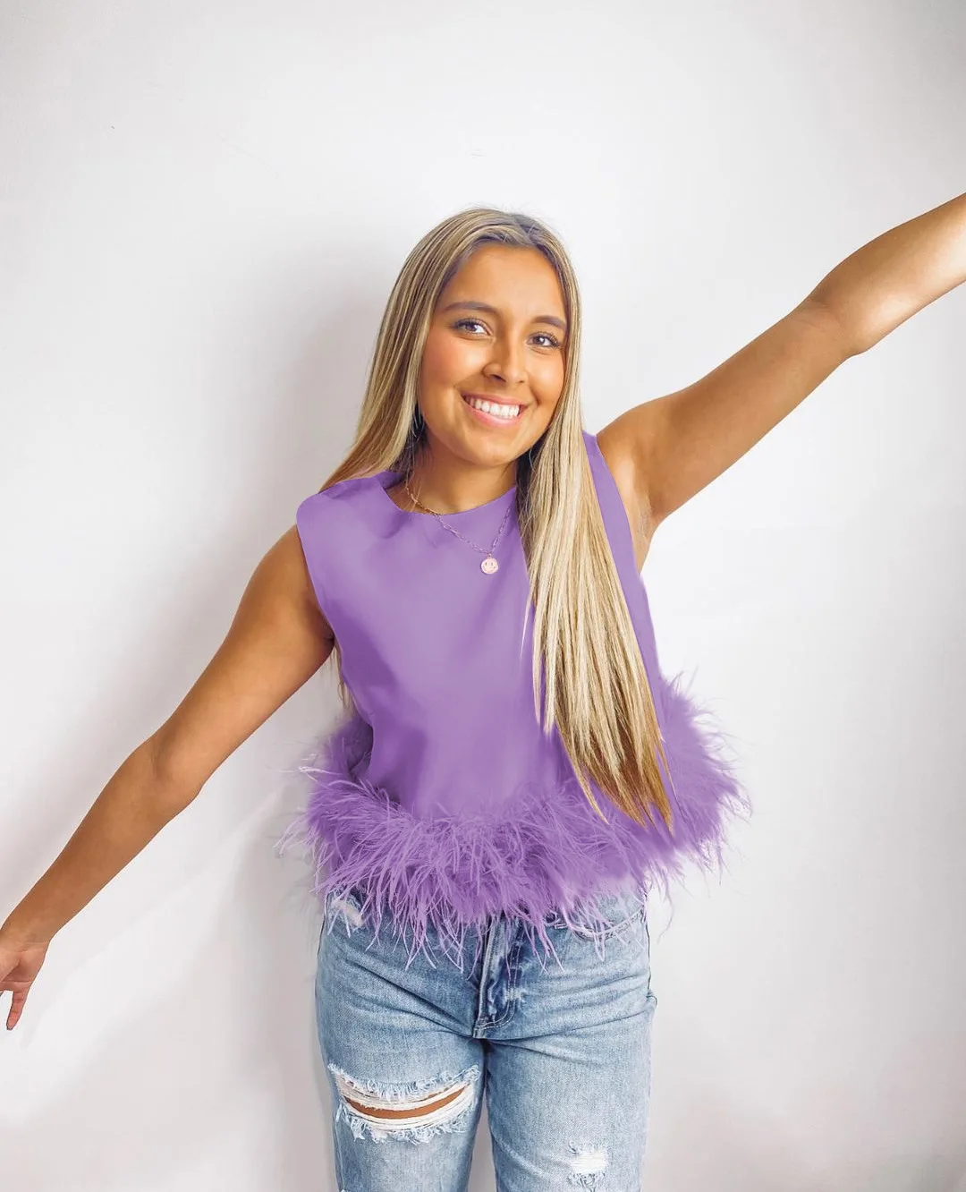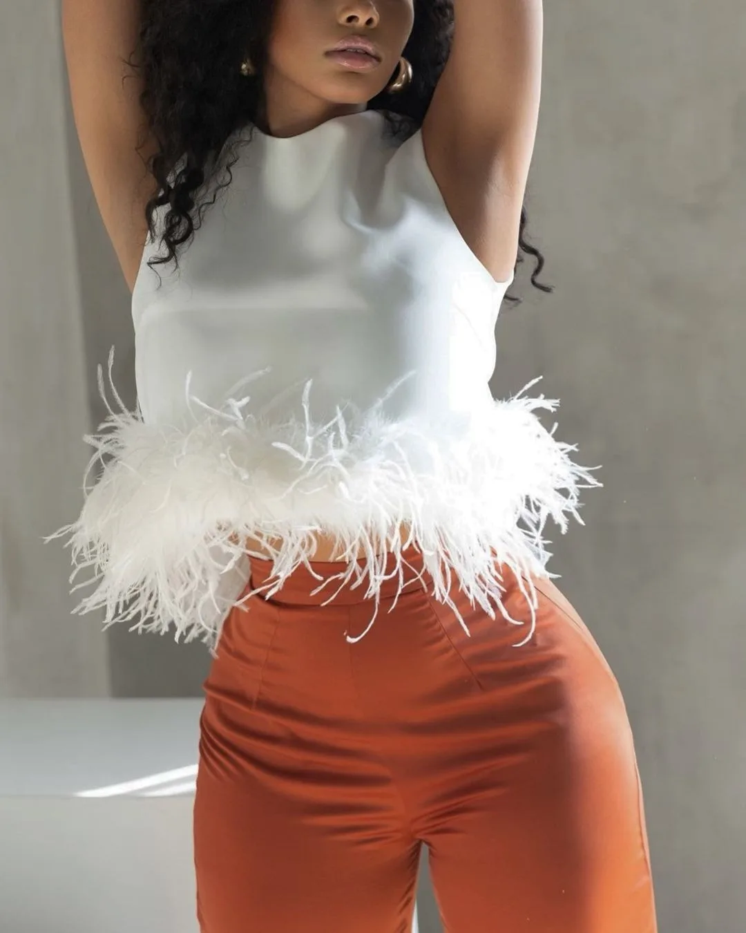 Отзывы о Женский укороченный топ без рукавов с пушистыми перьями летний однотонный