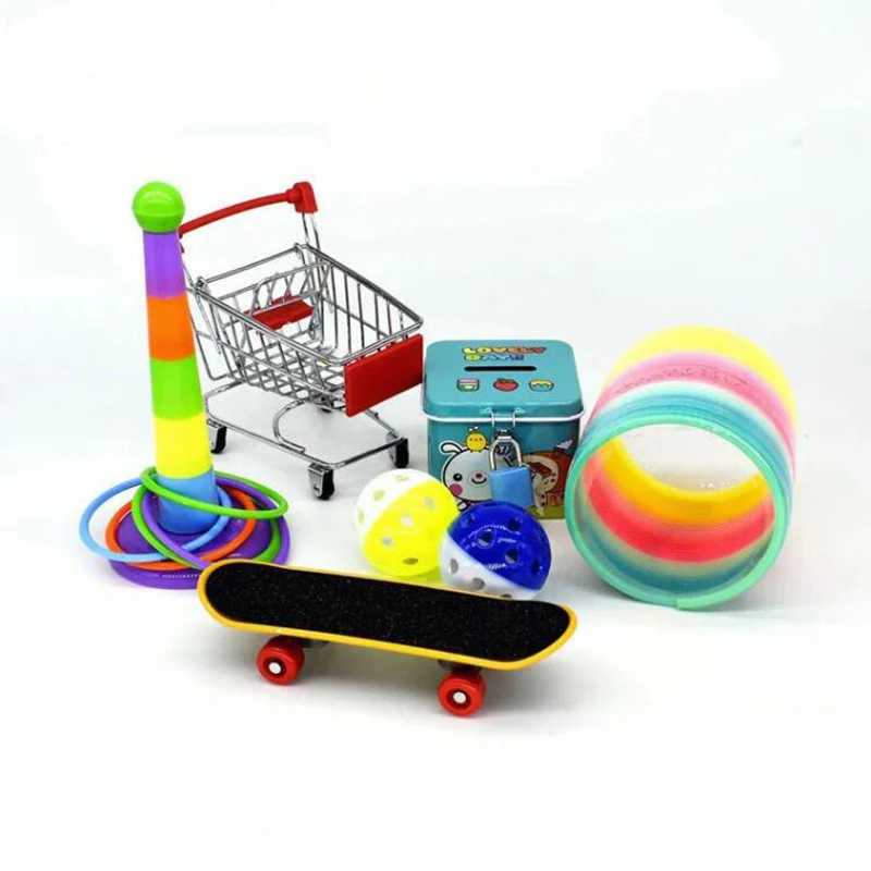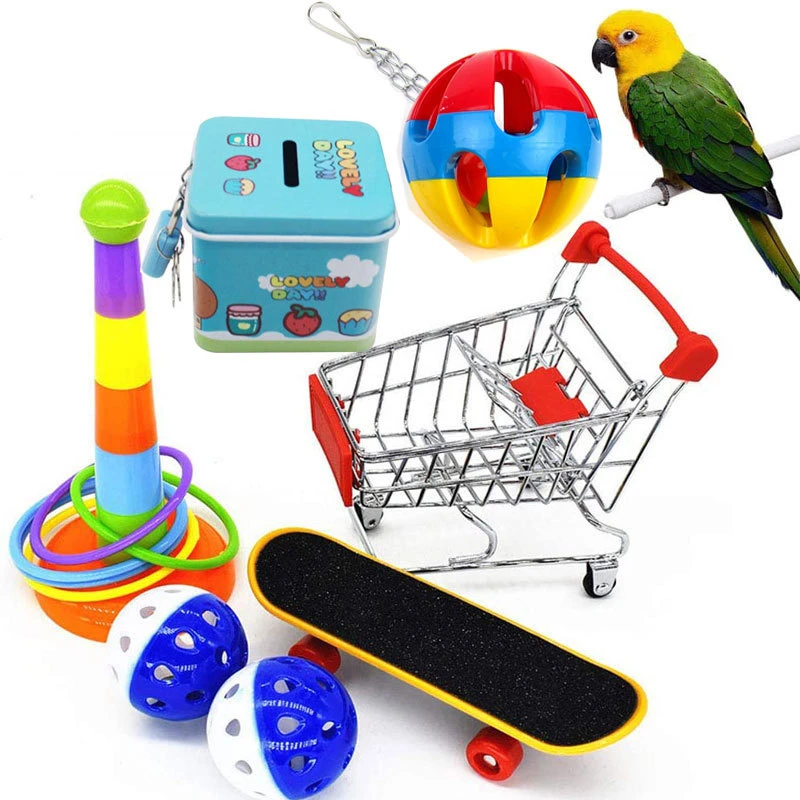 6 шт.: 1 x корзина для покупок с птицами, 1 x игрушка с кольцом для укладки птиц, 1 x скейтборд с птицами, 2 x игрушки для птиц, маленькие шарики с колокольчиками, 1 x копилка с попугаем