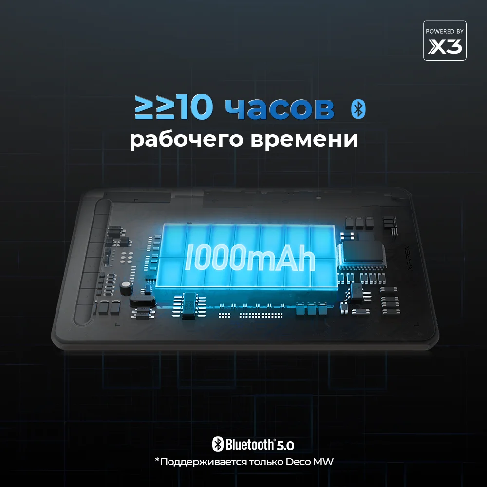 Графический планшет Deco МW работает более 10 часов от литиевой батареи большой емкости (1000 мАч / 3,7 В), которая обеспечивает заряд в течение всего дня.