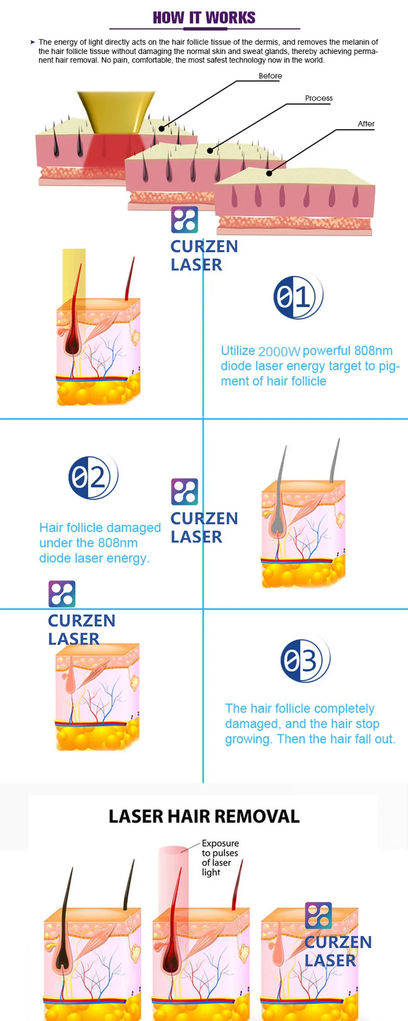 Светильник воздействует непосредственно на ткань волосяного фолликула дермы и удаляет меланин волосяного фолликула без повреждения нормальной кожи и потовых желез, тем самым обеспечивая постоянное удаление волос. Нет боли, удобно, самая безопасная технология в мире.