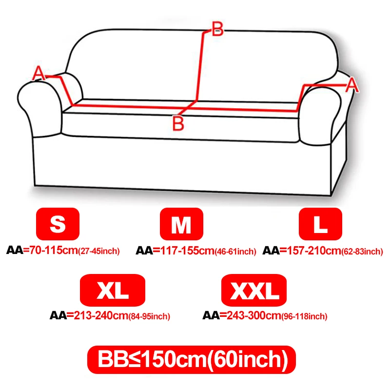Для того, чтобы продукт, который вы покупаете, подходит для вашего дивана, Пожалуйста, проверьте размер перед размещением заказа. Таблица размеров 1 Пожалуйста, тщательно измерьте размер вашего дивана. Также учитывайте подлокотники. Если вы не принимаете подлокотники во внимание, чехол для дивана может не поместиться на вашем диване. 1. Для S-Size дивана крышка, длина (AA) дивана должна быть в пределах 90-140 см (35-55 дюймов) 2. Для размера M длина крышки дивана (AA) дивана должна быть в пределах 145-185 см (57-73 дюйма) 3. Для размера L длина крышки дивана (AA) дивана должна быть 190-230 см (75-91 дюйма) 4. Для размера XL длина крышки дивана (AA) дивана должна быть 235-300 см (92-118 дюймов) 5. В то же время обратите внимание, что для четырех размеров чехлов для диванов ширина (BB) вашего дивана должна быть в пределах 150 см (60 дюймов). Например: если AA = 200 см (78 дюймов), CC = 140 см (55 дюймов), то вам следует перейти на 1 диван l-размера.