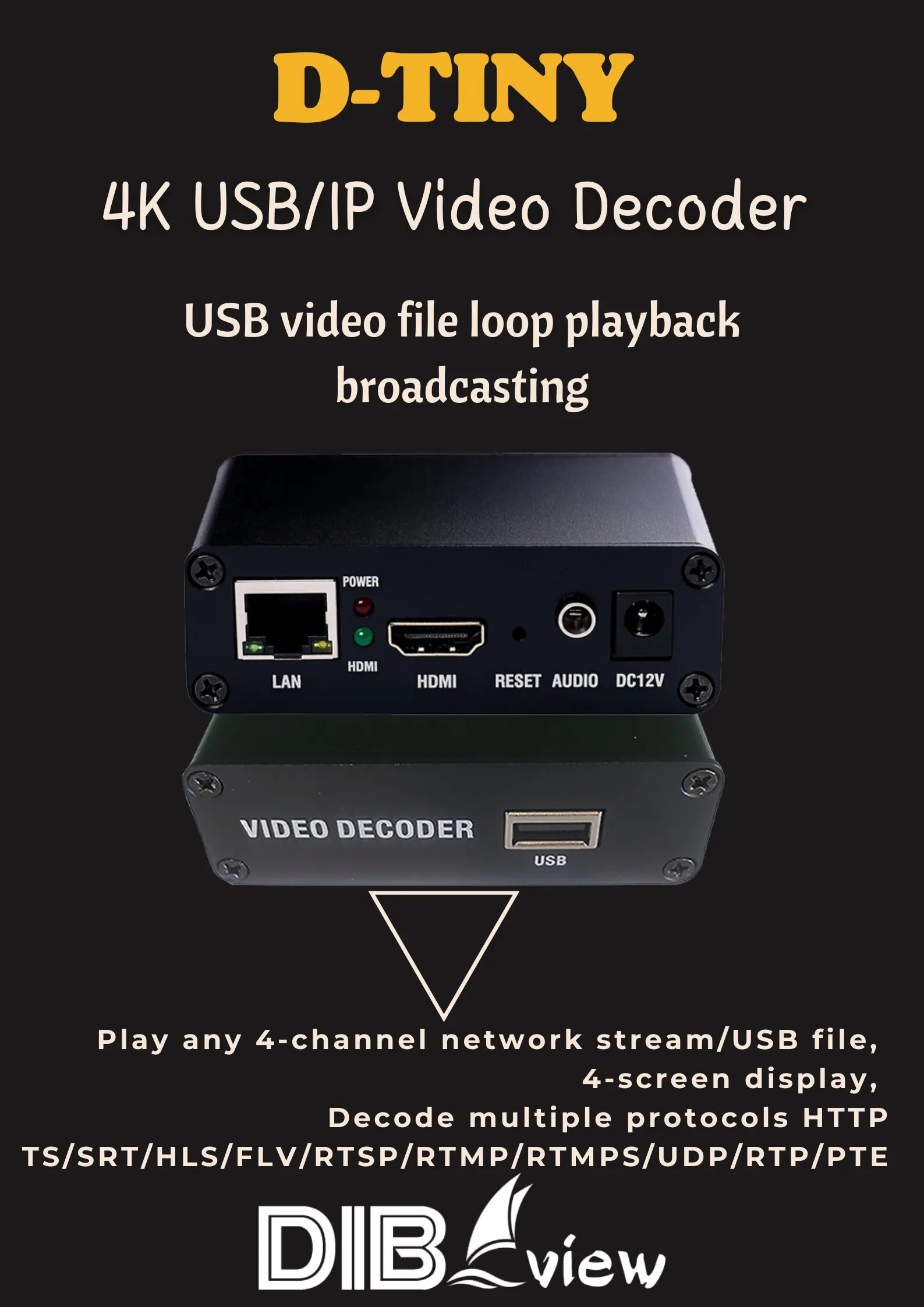 Потоковый декодер D-Tiny ProHD H.265/H.264 с hdmi-выходом, в котором используются передовые технологии сжатия видео H.265, интегрированная передача данных через HLS/RTSP/HTTP TS/HTTP FLV/RTMP/UDP со встроенной операционной системой,