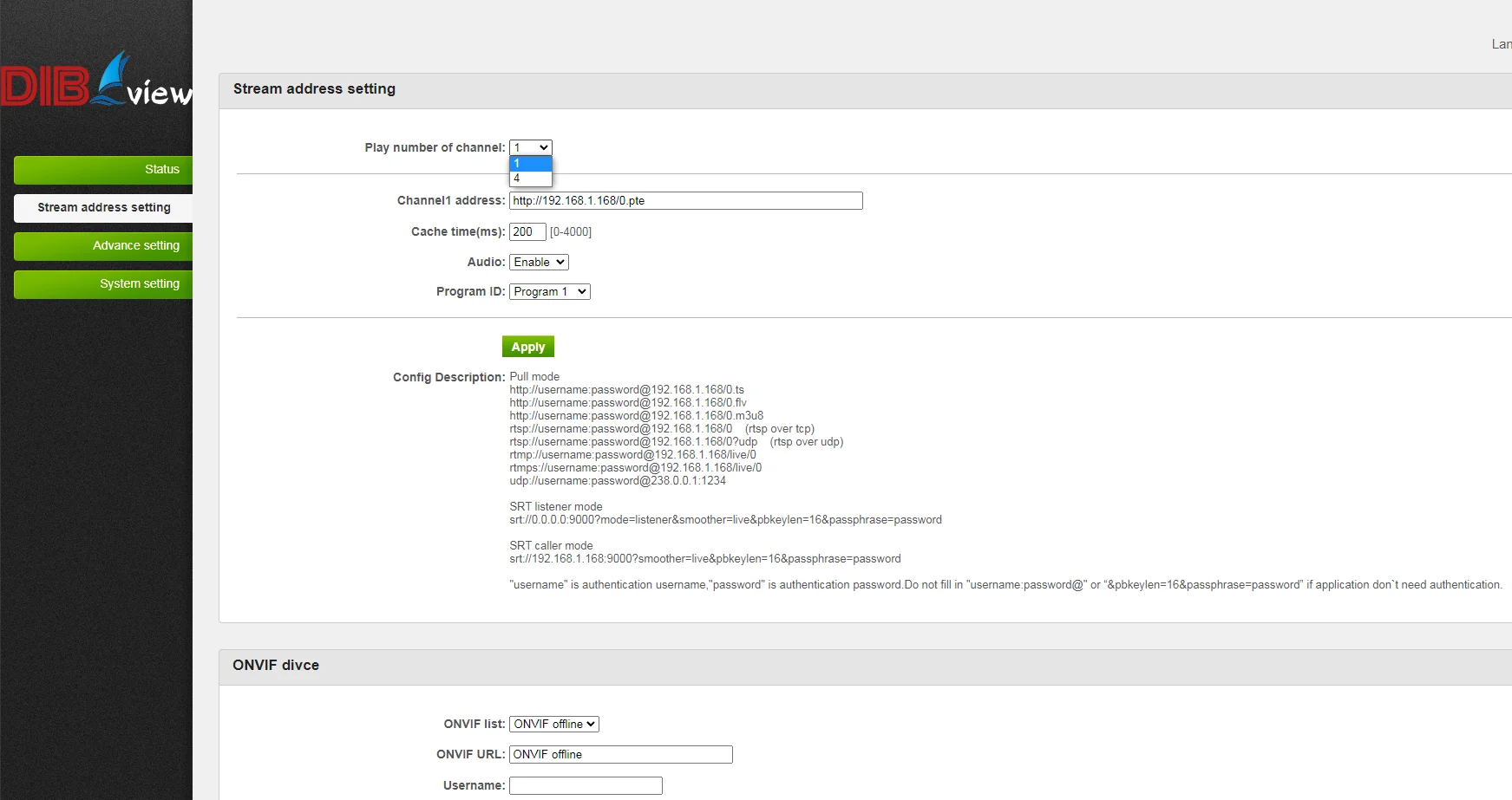 Тип: G711A/G711U/AAC + +/MP2/MP3 Каналы: одноканальный/двухканальный Частота дискретизации: 8000/11250/22500/44100/48000 Каналы: 1 | |