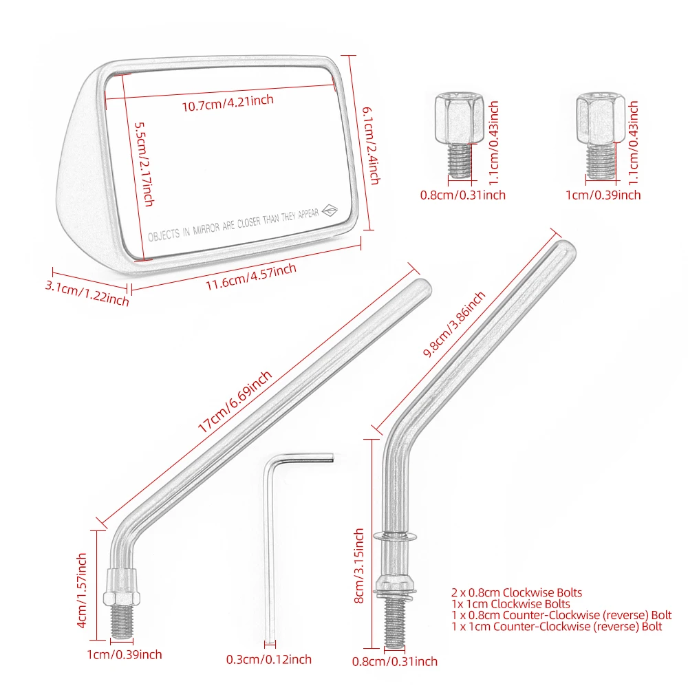 1 комплект (слева и справа) зеркал, 2x8 мм для зеркальных стеблей модель Харли; 1x10 мм болты по часовой стрелке и 1x10 мм болты против часовой стрелки; 2x8 мм болты по часовой стрелке и 1x8 мм болты против часовой стрелки