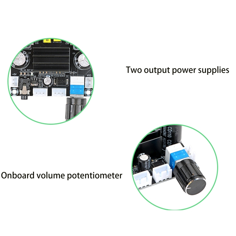 Три входных порта, DC5V/DC12V выходное напряжение, с бортовым потенциометром регулировки громкости, который может регулировать громкость бортового объема.