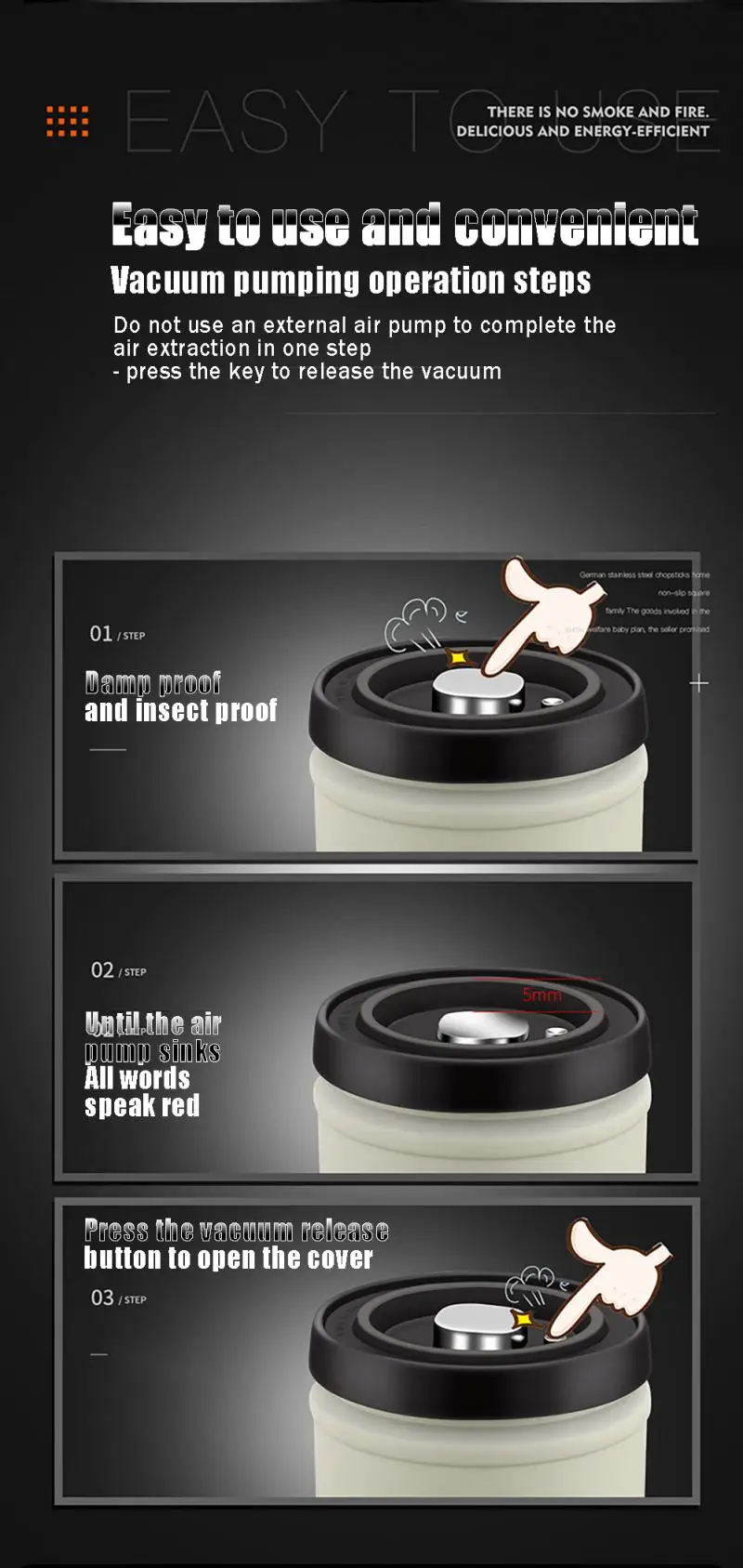 Высокий вакуум для долгосрочного сохранения, путем нажатия сверху, избыток газа в резервуаре разряжается, уменьшая контакт между пищей и кислородом, и достижения цели продления сохранения пищи
